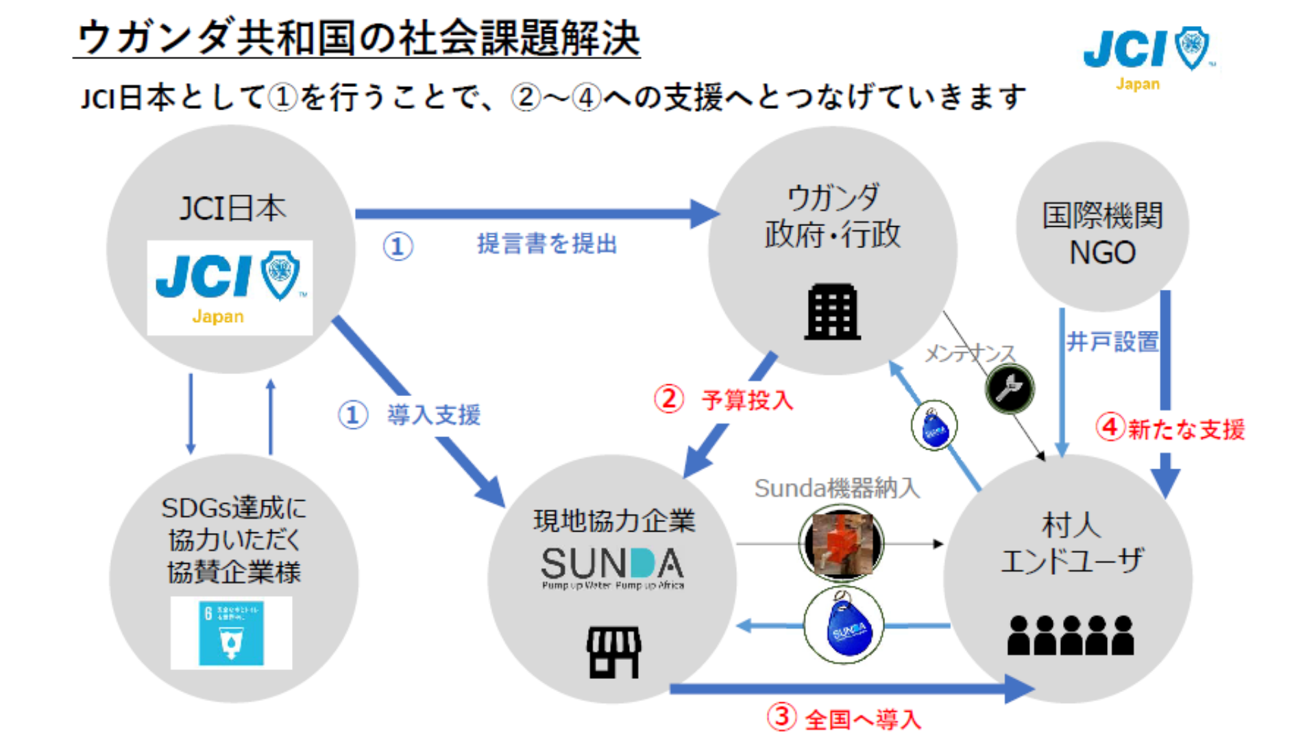 その国家予算投入の契機を作るためには、県、郡単位(100基前後の単位)のまとまった導入実績が必要です。JCI日本のSMILE by WATER事業として、同システムの導入実績を作り、ウガンダ政府に同システムの必要性と可能性を訴えていくことは、ウガンダにて20年以上解決されていない社会課題を解決の糸口を見出すことにつながり、SDGsのゴール6の達成に向けた大きな運動となります。