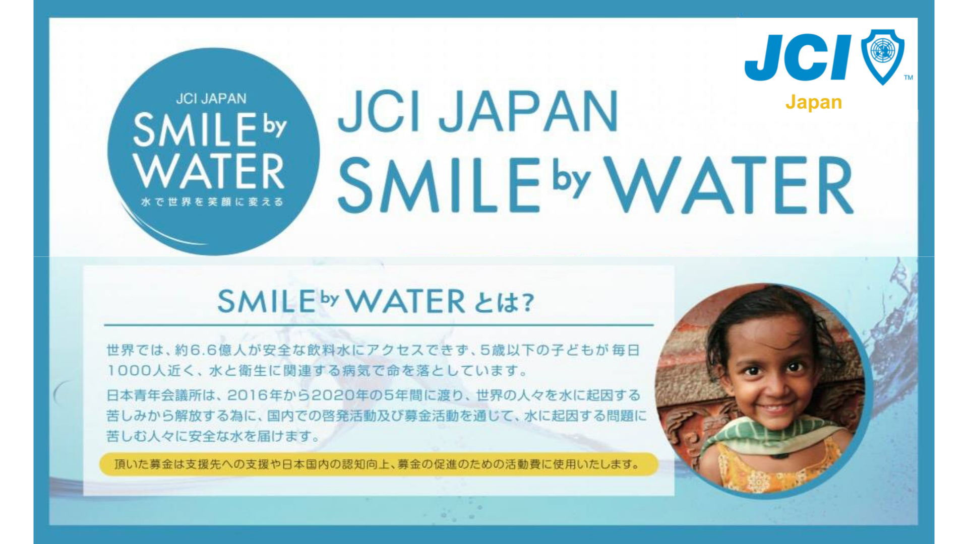 公益社団法人日本青年会議所では、本年より世界各国に「安全な水」を届ける、JCIJAPAN SMILE by WATER(スマイル・バイ・ウォーター)キャンペーンを展開します。これまでには、