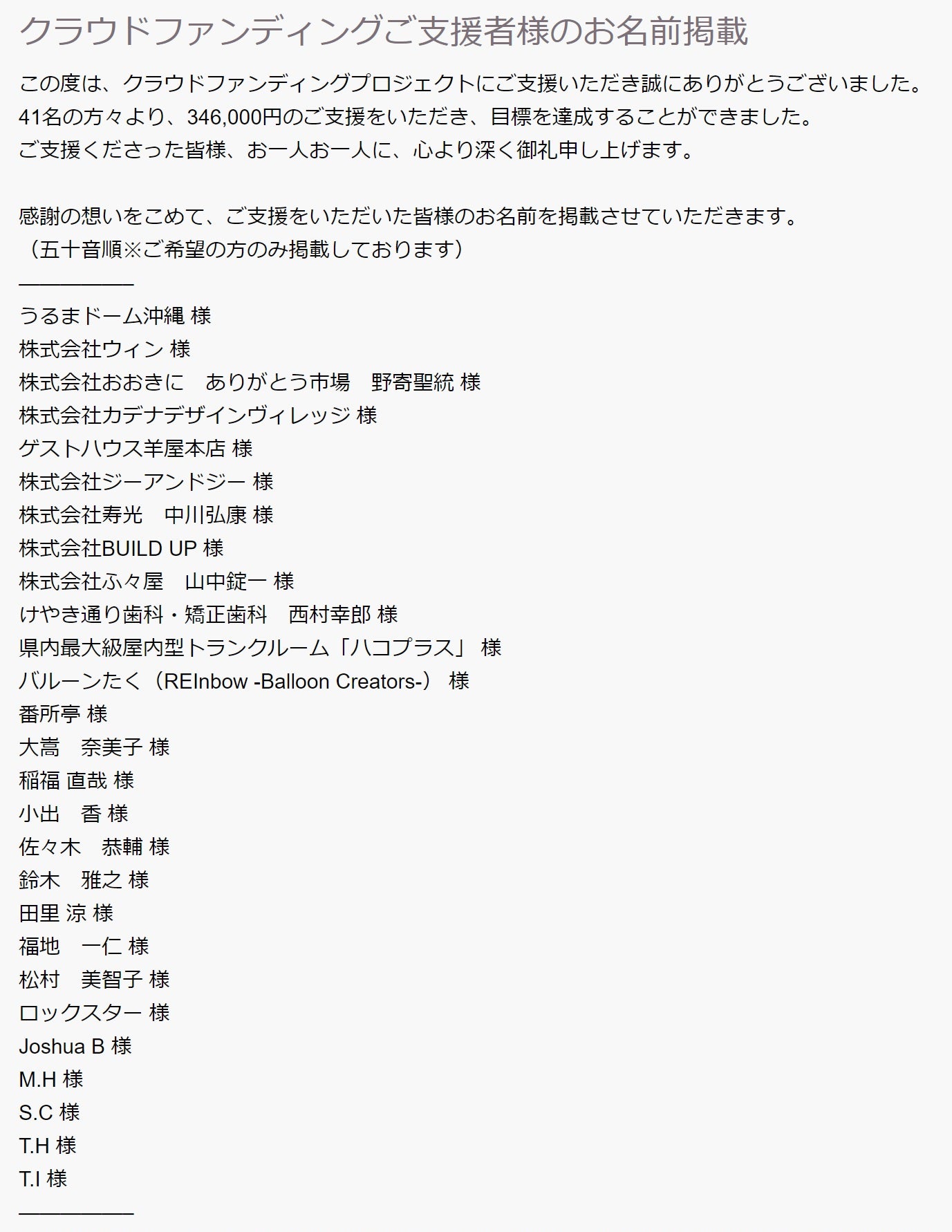 2022/07/14 10:42クラウドファンディングにご協力いただいたご支援者様のお名前をホームページに掲載させて頂きました。(掲載を希望されたご支援者様のお名前を、ご希望された表記方法で掲載をさせていただいております。)ご支援者様のお名前掲載ページ掲載を希望されているにもかかわらずお名前が掲載されていない場合や、お名前に不備がある等の場合は誠に申し訳ございません。恐れ入りますが、事務局[wro.okinawa.suisin@gmail.com]までメールにてご連絡いただけますと幸いです。上記にお名前を掲載させていただいた方々をはじめ、クラウドファンディングにお力添えいただいた全ての皆様に心より感謝申し上げます。この度は本当にありがとうございました。 もっと見るプロジェクト成功のお礼