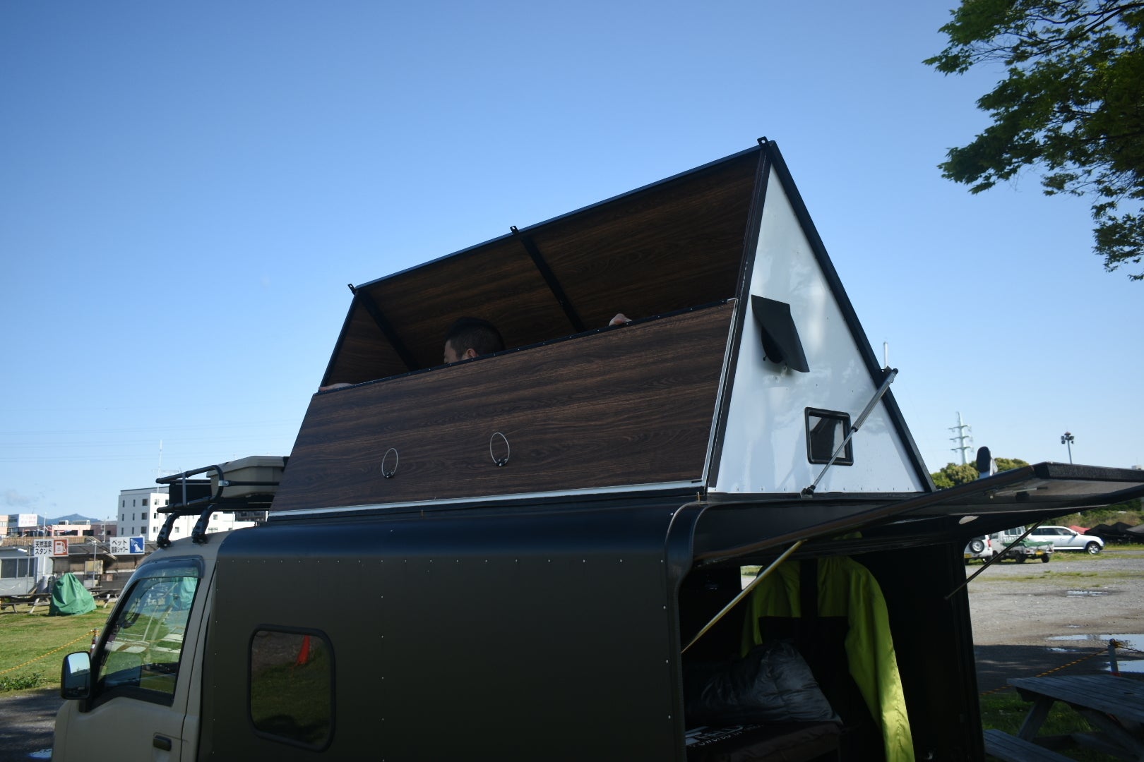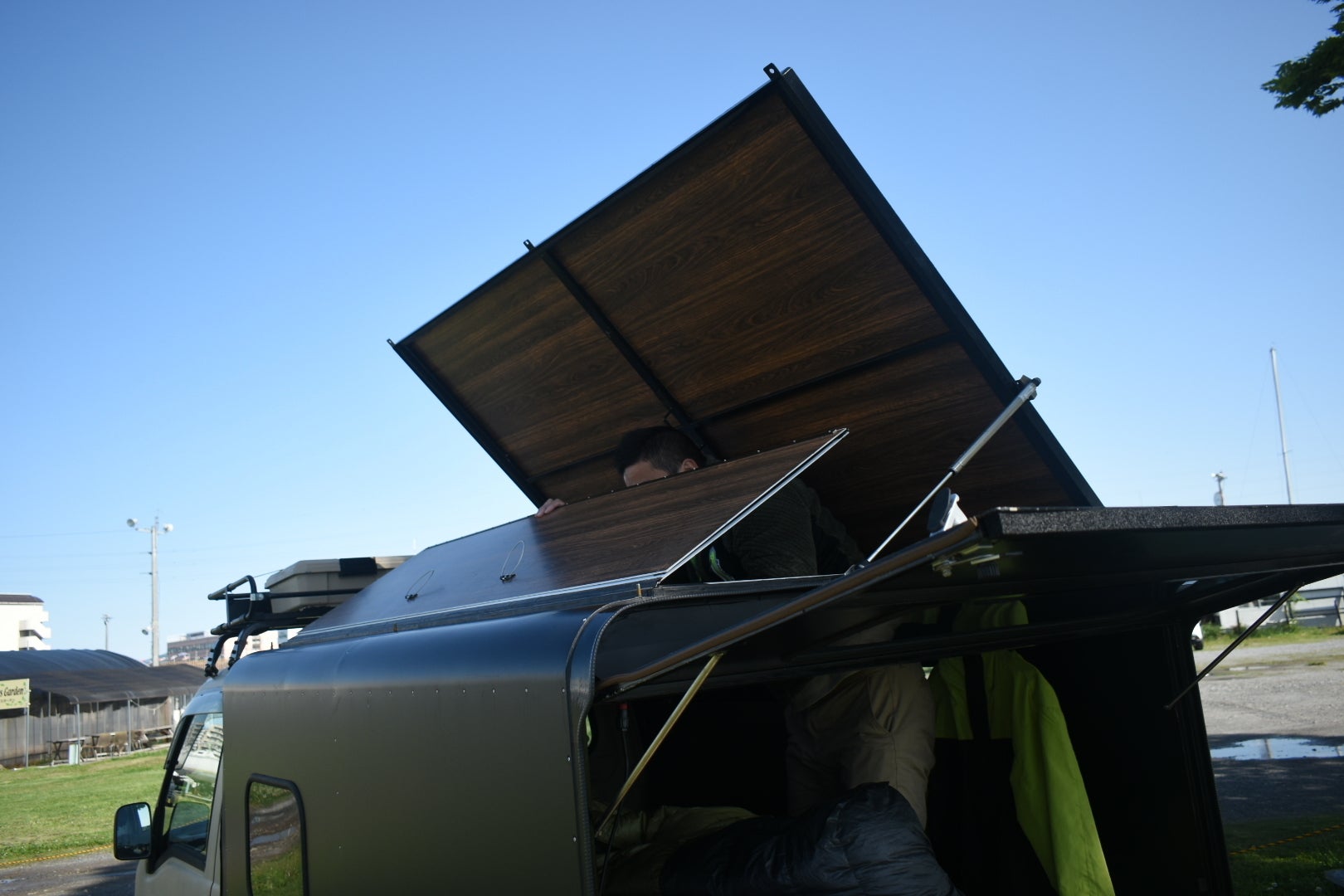 ポップアップすることで生まれる居住空間。キャンプ用のテーブル・マット・シュラフ・チェアを持ち込めばそこは快適な居住スペース。テーブルの上でノートパソコンを広げればそこはオフィスにもなります。