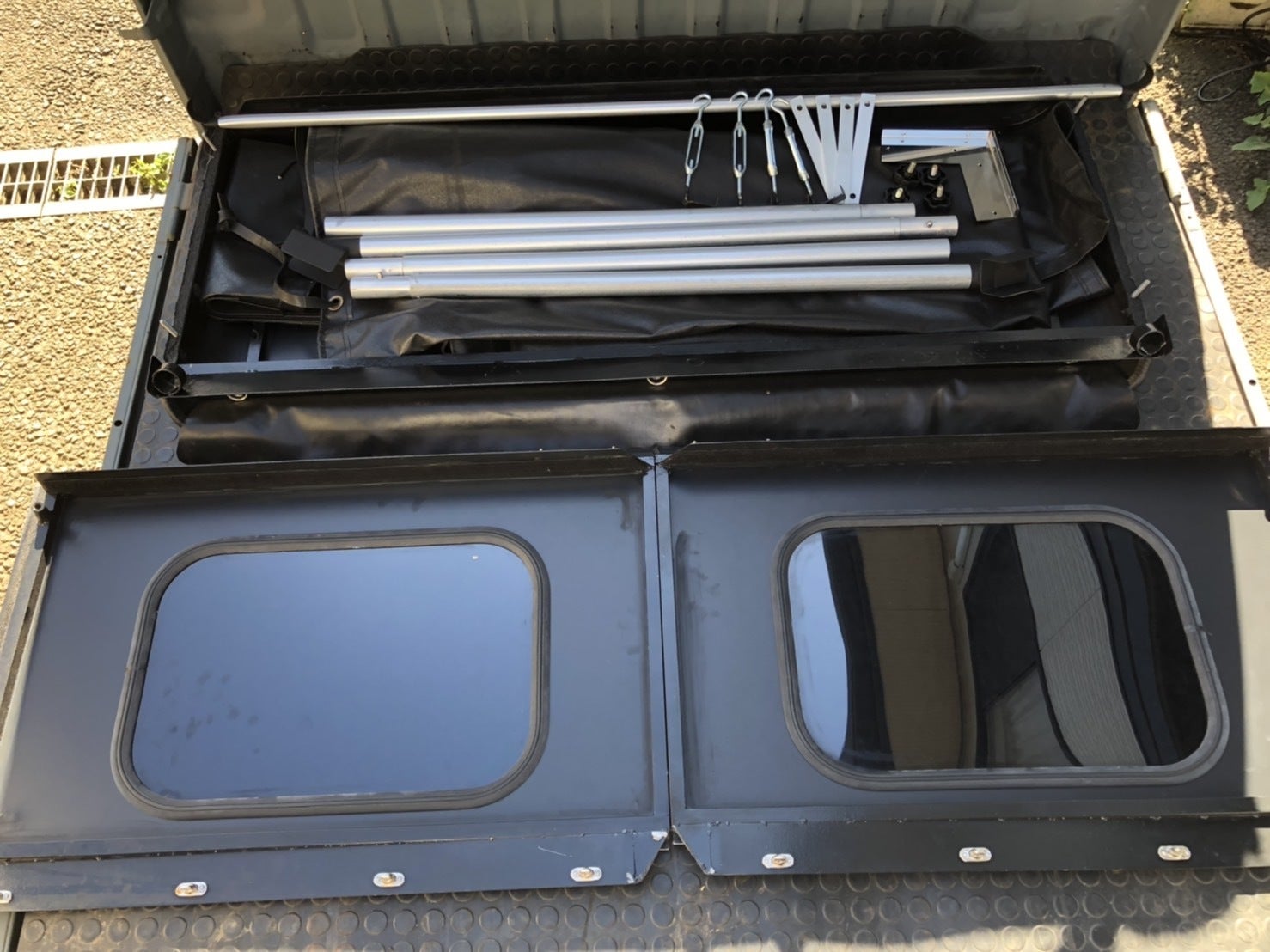 フルパネルポップアップタイプでも同様ですが、当社の軽トラック用汎用コンテナは仕事でも使える事をコンセプトしております。ショートタイプの場合は、幌やバーを脱着することで、仕事の際は、長尺物や高さのある荷物などの積載も可能です。また遊びの際は荷台上にリビングを作るもよし、リビングは車外に作り就寝時のテント利用としても良しと、関単に仕事と遊びの両立が可能です。