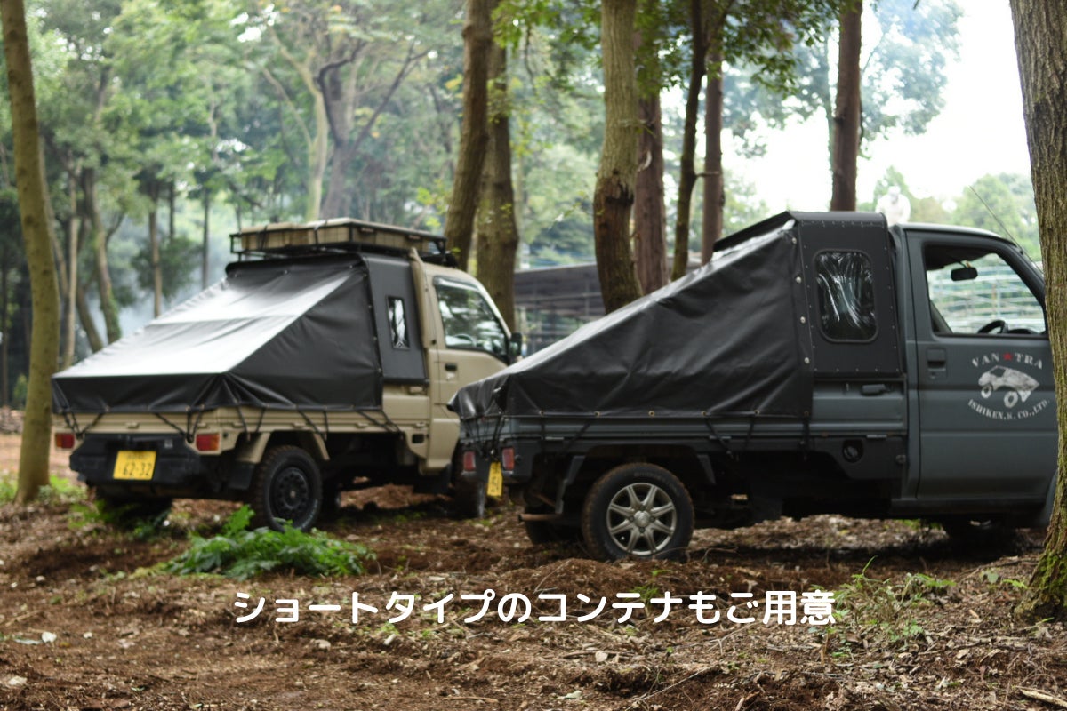居住性を最大化した「フルパネルポップアップタイプ」をメインに、オフロードが良く似合う「ショートタイプ」と2種類のコンテナを今回ご用意しております。