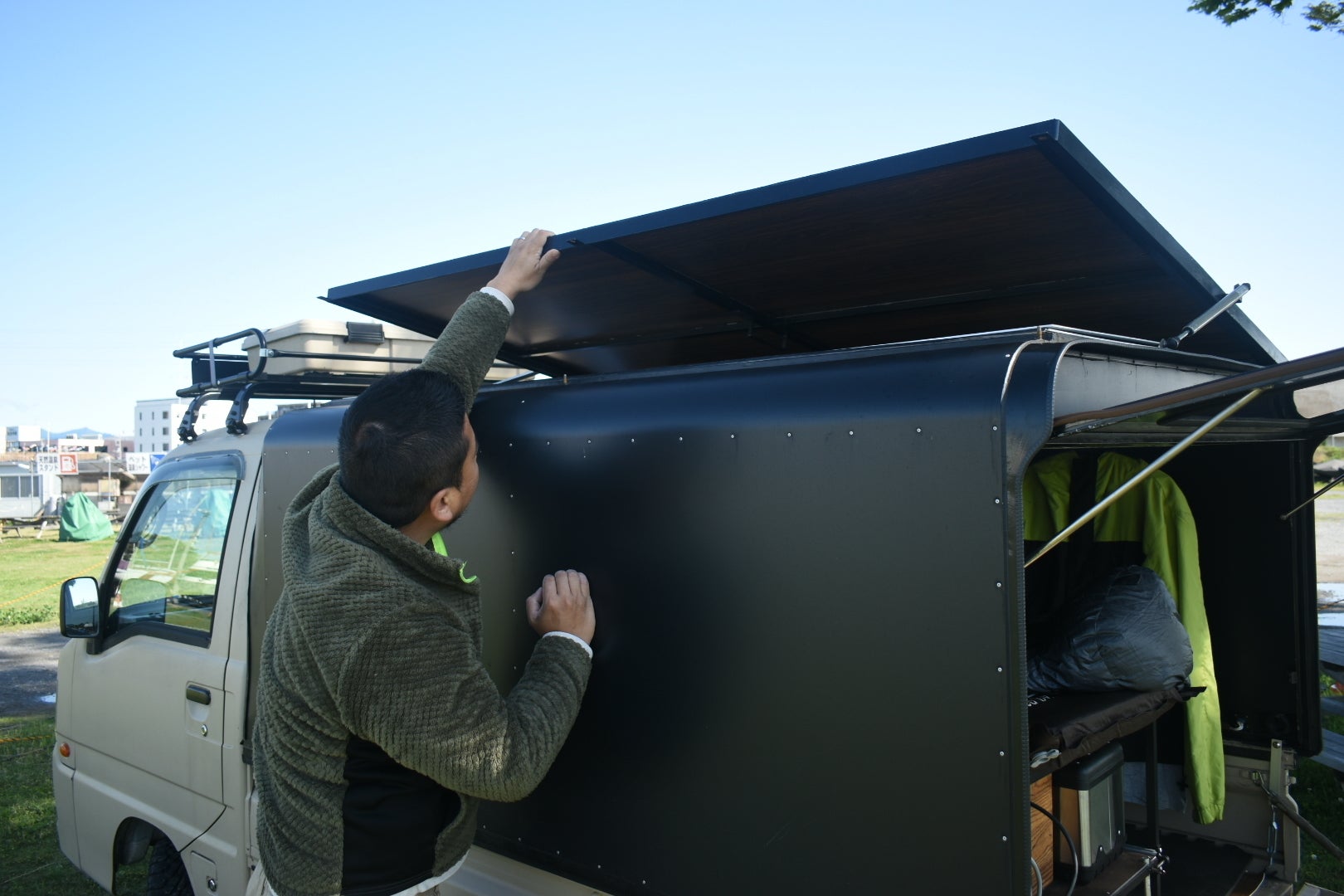 鉄のフレームにアルミ複合パネルの外装は堅牢さが違います。駐車時に展開するポップアップ部までパネルのため、多少の雨風はものともしません。荷台泊時の安心感が違います。