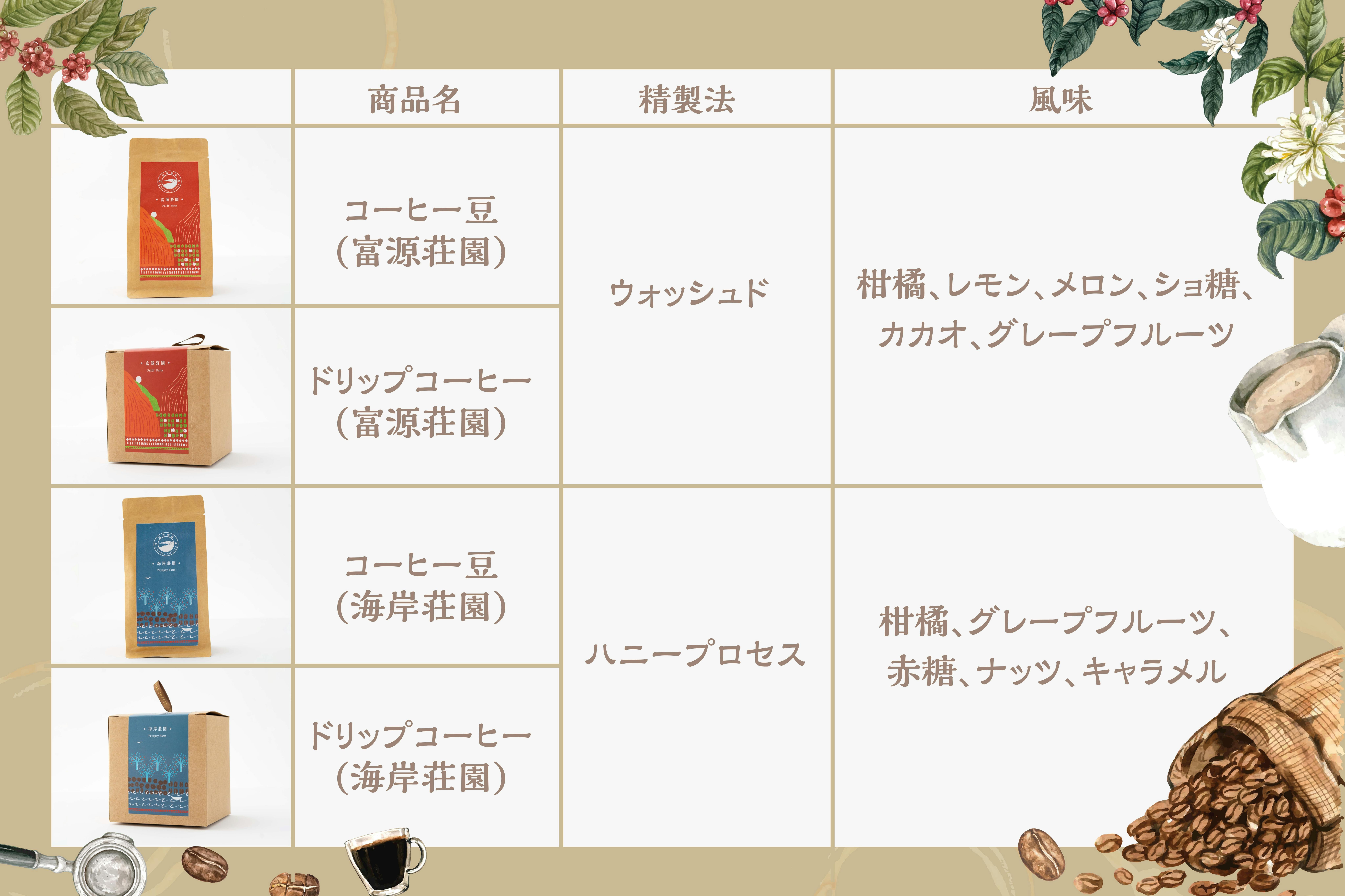 最初は ”自身が飲みたいからと作ったコーヒー” なのですが、格別に美味しいと感じたことをきっかけに、自分しか飲めない、自分しか知らないのは非常に勿体無い!との思いで、この肥沃の緑の大地と水のもと、2016年に娘の「許清娟(シュ・チンジュエン)」さんと、自然農法 (化学肥料や農薬を使用しない栽培方法 )で植えたコーヒーの木を育て『海岸珈琲』を創立しました。