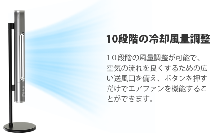 10段階の風量コントロールを備え、パワフルかつ省エネ(0.81円/時)、スタイリッシュなデザインで、場所を取らず、ベッドの上からリビングまで幅広く利用可能です。