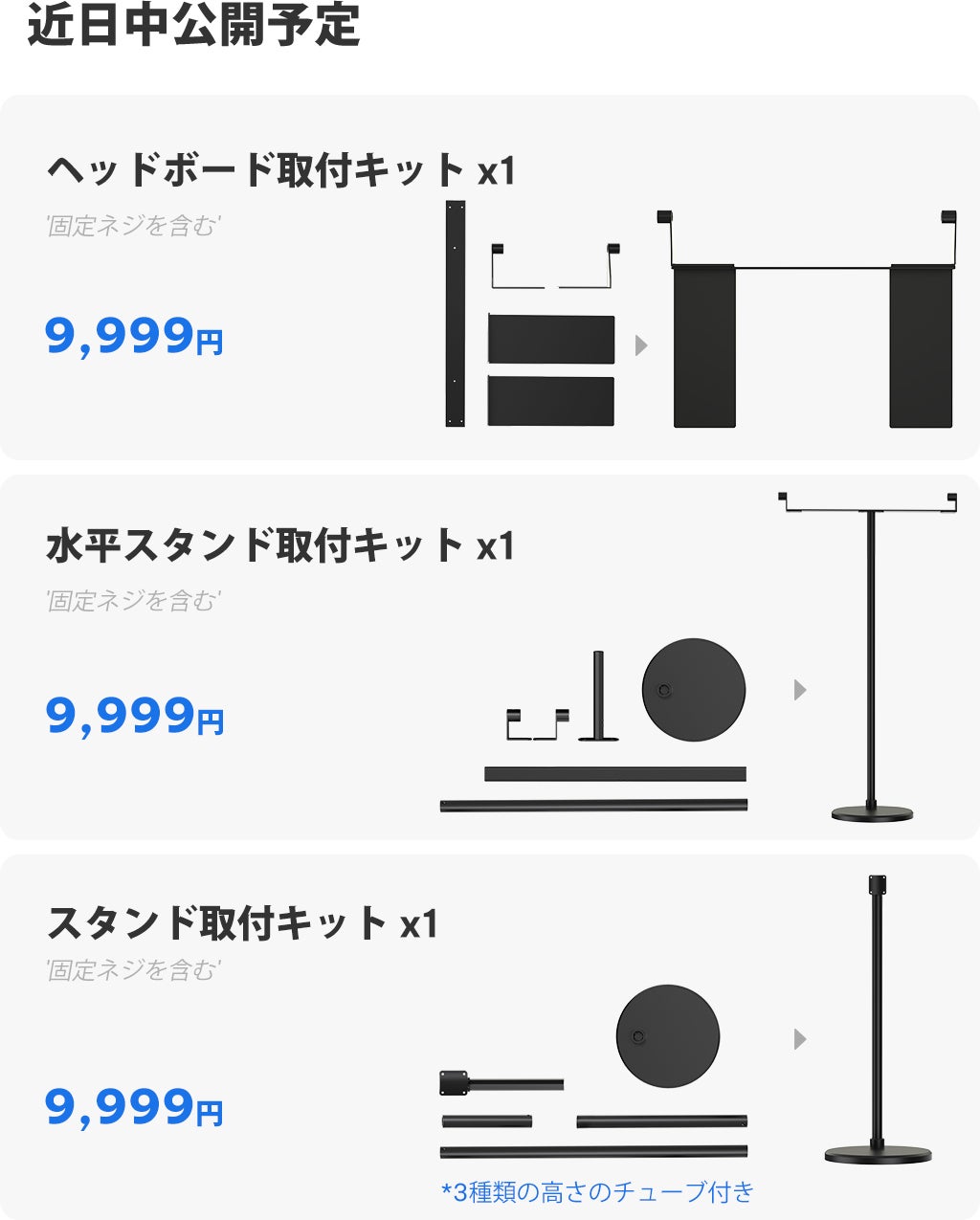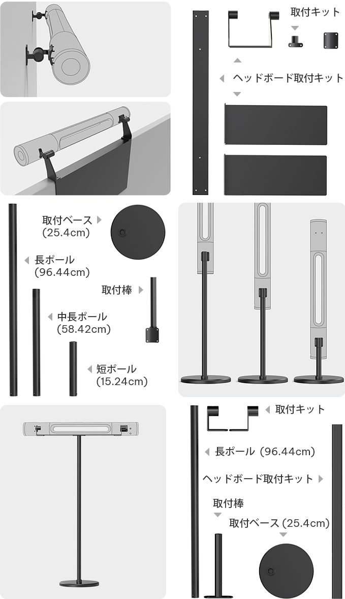 壁掛けキット(下図の左上)のみがパッケージに含まれています。