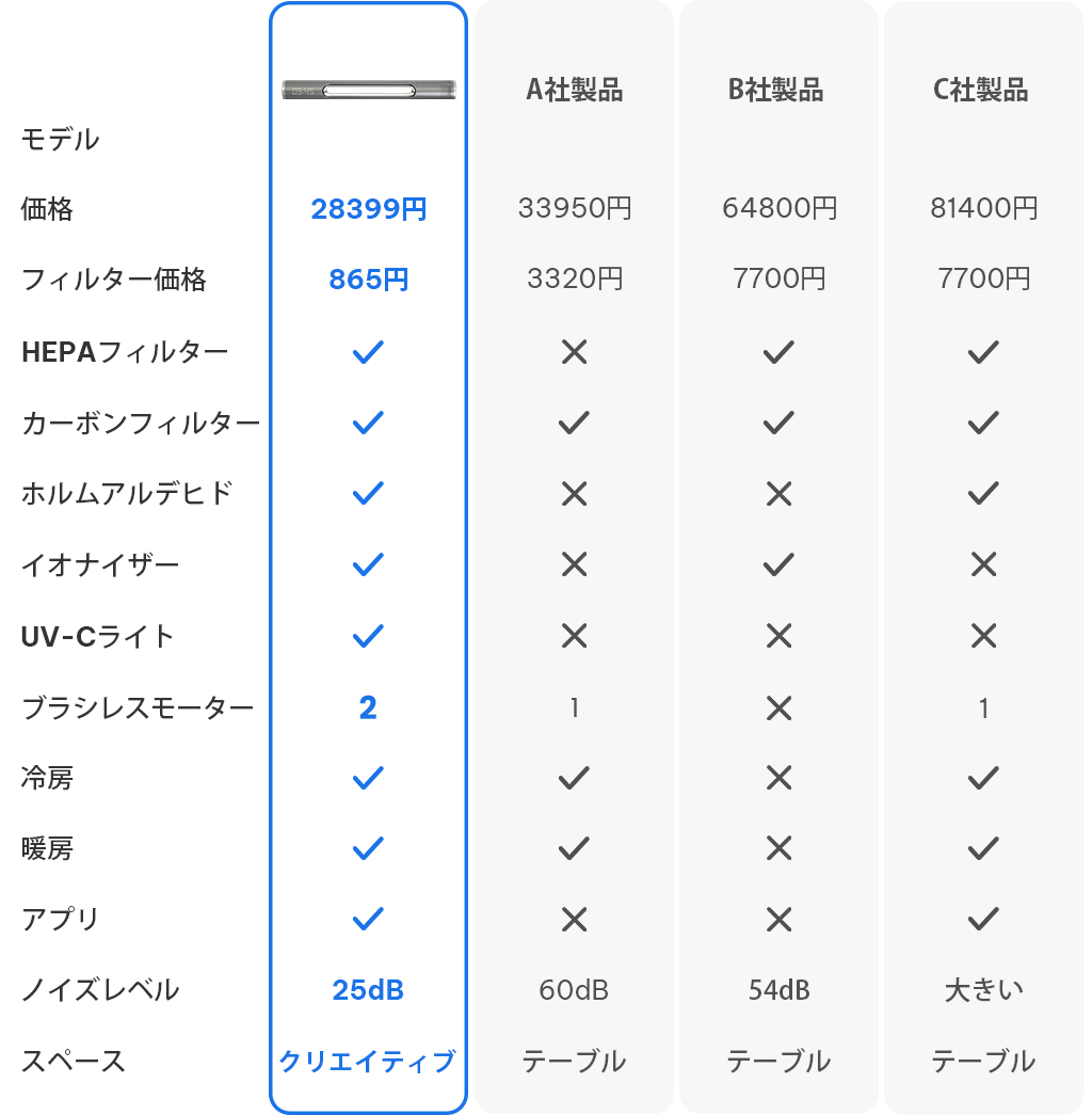 高性能な空気清浄機能が搭載されています。常に新鮮な空気を手に入れることができます。