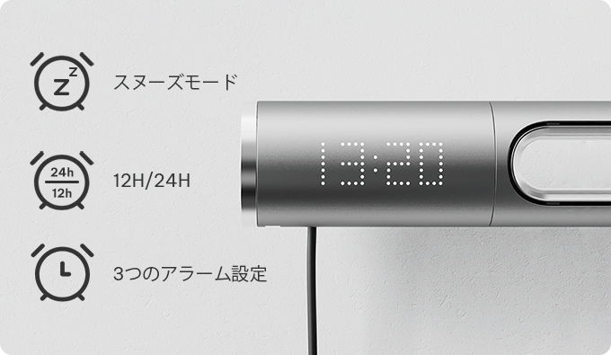 コンパクトでモダンなデザインの時計機能にはスマートな機能が多数搭載されています。例えば、お気に入りのアラーム音を鳴らすことができます。
