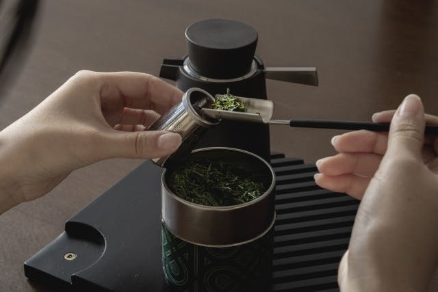 お湯が適温になったら、インフューザー(茶こし)へ茶葉を適量入れます。