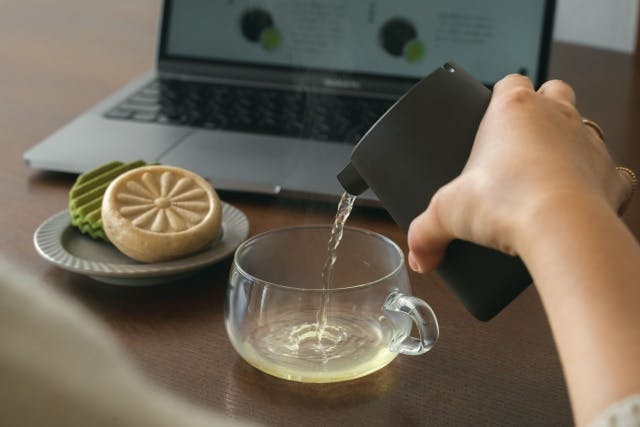 完成したお茶は付属のカップで何回かに分けて楽しむほか、お気に入りのティーカップや湯飲みでもお楽しみいただけます。
