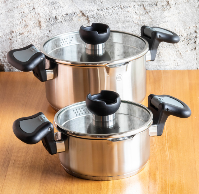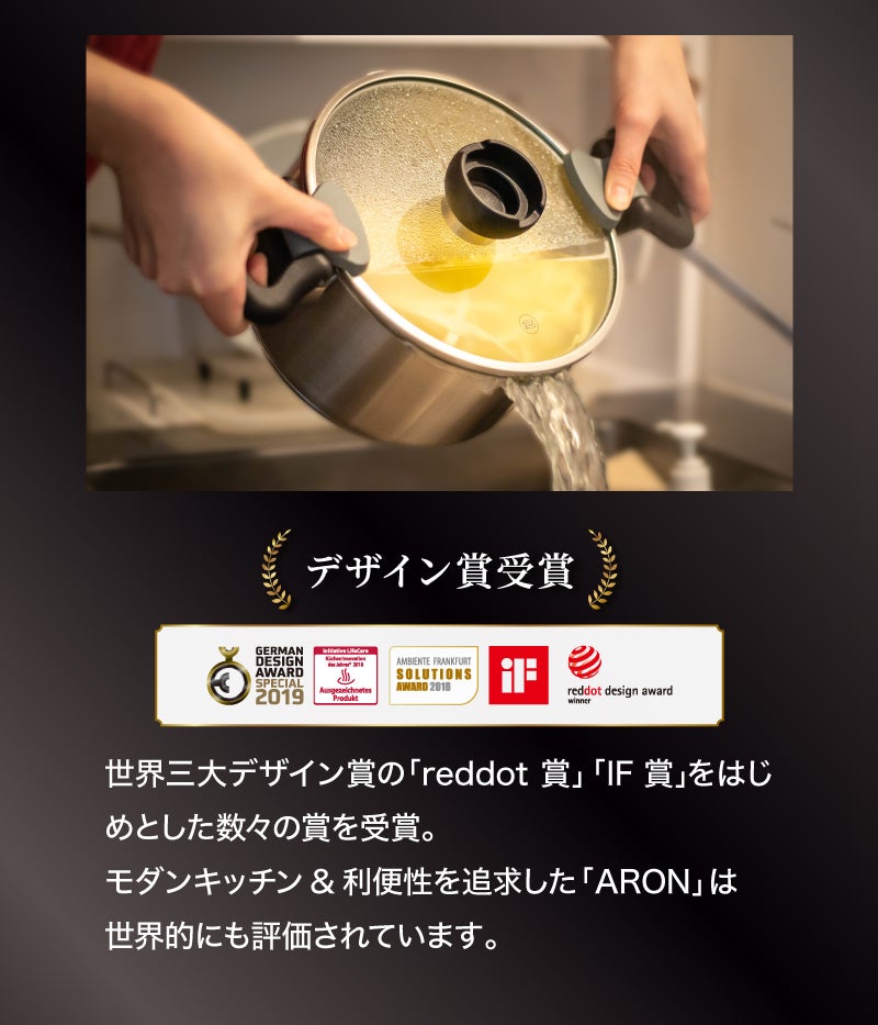 伝統の技術は残しながらもドイツメーカーらしいスタイリッシュな外観とステンレスのきらめきが両手鍋「ARON」の高級感を引き立てています。