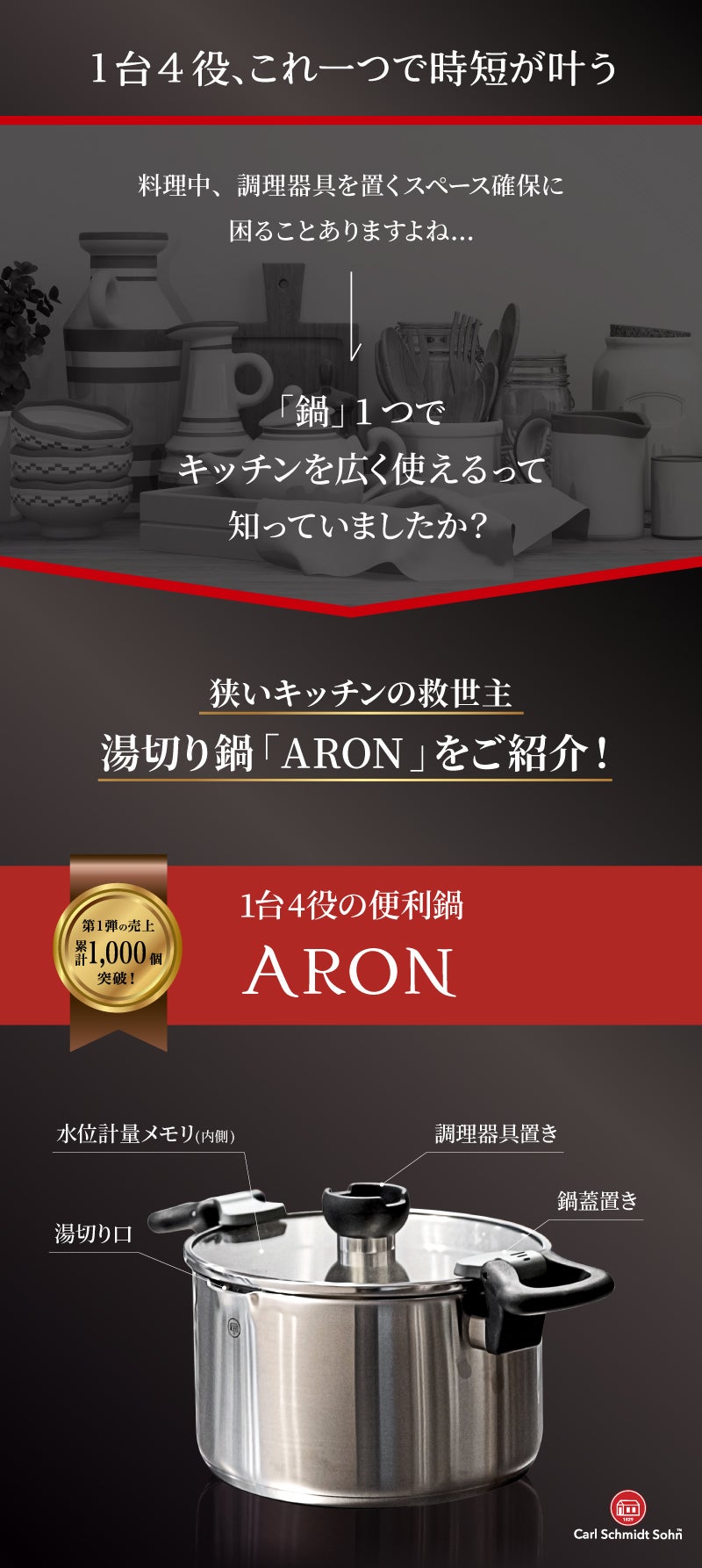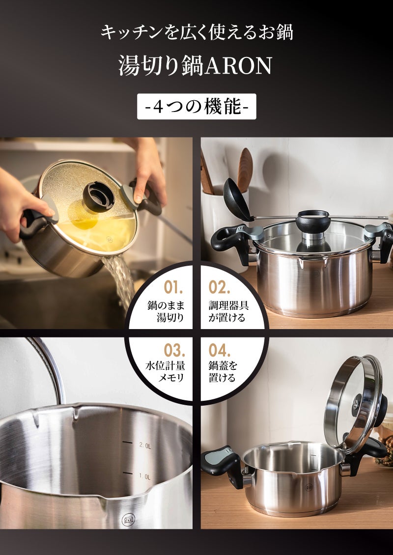1台4役のキッチンを劇的に広く使える湯切り鍋「ARON」がパワーアップしてmachi-yaに登場!