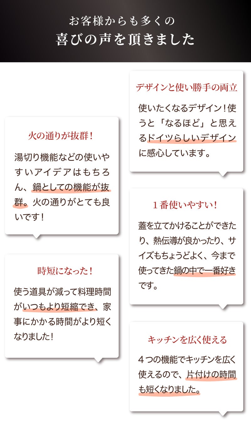 2022/06/30 11:35こんにちは。OKIAMIです。いよいよ本日でプロジェクトが最後となりました。CarlschmidtSohnはハイブランドのみが採用する、ヒートギャザー方式を採用してムラなく、サッとお湯が沸く熱伝導性を維持した両手鍋です。さらには蓋を立てかけたり、お玉をおけたりとキッチンを広く使える機能がついています。文面でみると「便利だなぁ」くらいにしか伝わらないと思いますが、実際調理をしている時はものすごく便利です!・お玉をそのまま台所に置くと衛生面がきになったり・あつあつの蓋を置く場所を探さなくてもよかったりちょっとした調理のストレスが一気になくなります!ドイツではゾーリンゲンブランドと言われるほど有名な会社が集まる金物の街にある創業193年の会社なので品質はもちろん、デザイン性もグッドデザイン賞より箔の高い世界3大デザイン賞を2つも受賞しています。8月にお届けできるので少し先ですが敬老の日にご親族にプレゼントしたり、自分へのご褒美に買い替えもおススメです!限定価格で購入できる最後のチャンスなのでぜひこの機会に購入ご検討下さい! もっと見る
