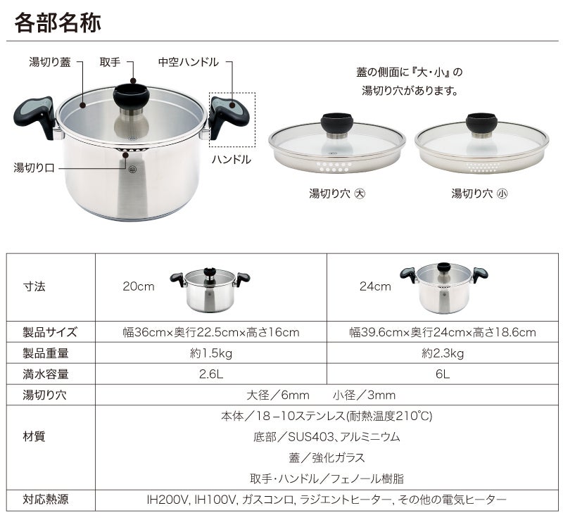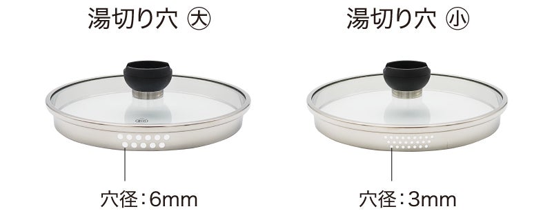 茹でるものに併せて2つの湯切り穴を使い分けることが出来ます。