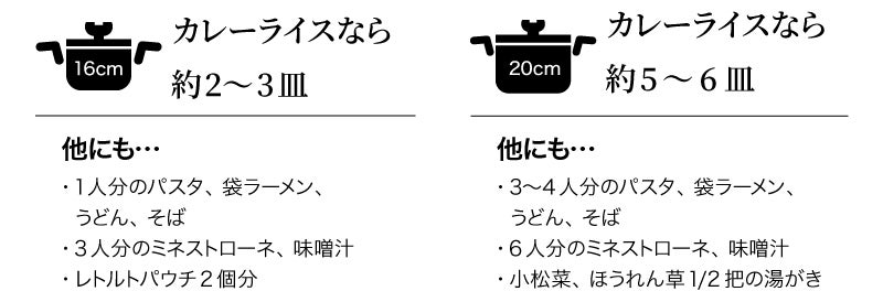 16cmは一人暮らしの方や、ちょっとした野菜の湯がきにも使いやすいサイズ感。20cmはカレーライス5〜6皿が作れる容量でした。