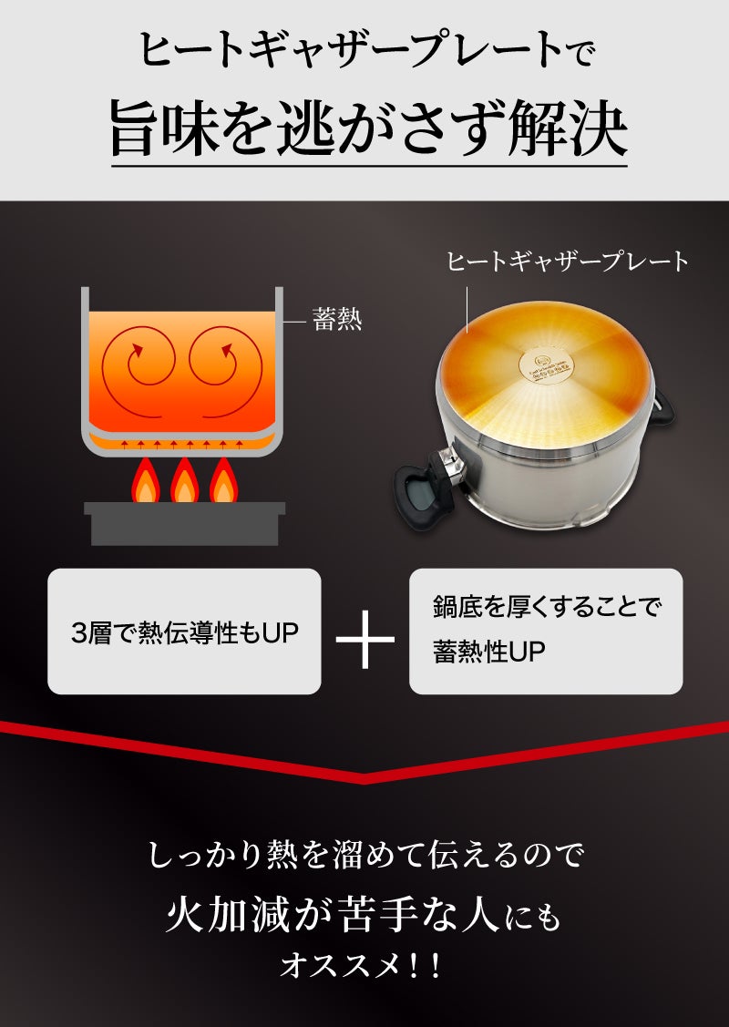従来の単層のデメリットである、熱の伝わりにくさを底面だけアルミを間に入れた3層構造で解決するとともに、鍋の周囲はステンレスの単層でできているので保温性も両立する事に成功しました。