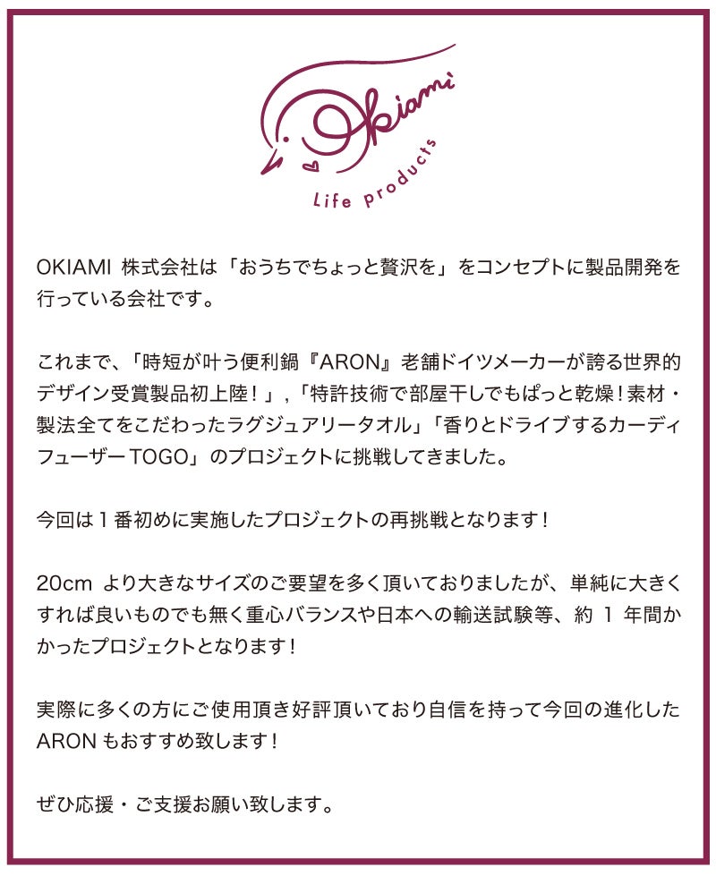 OKIAMI株式会社は、「おうちでちょっと贅沢」を目指した商品の開発やプロモーションに集まった資金は使用させて頂きますのでぜひお力添え頂けますと嬉しいです。