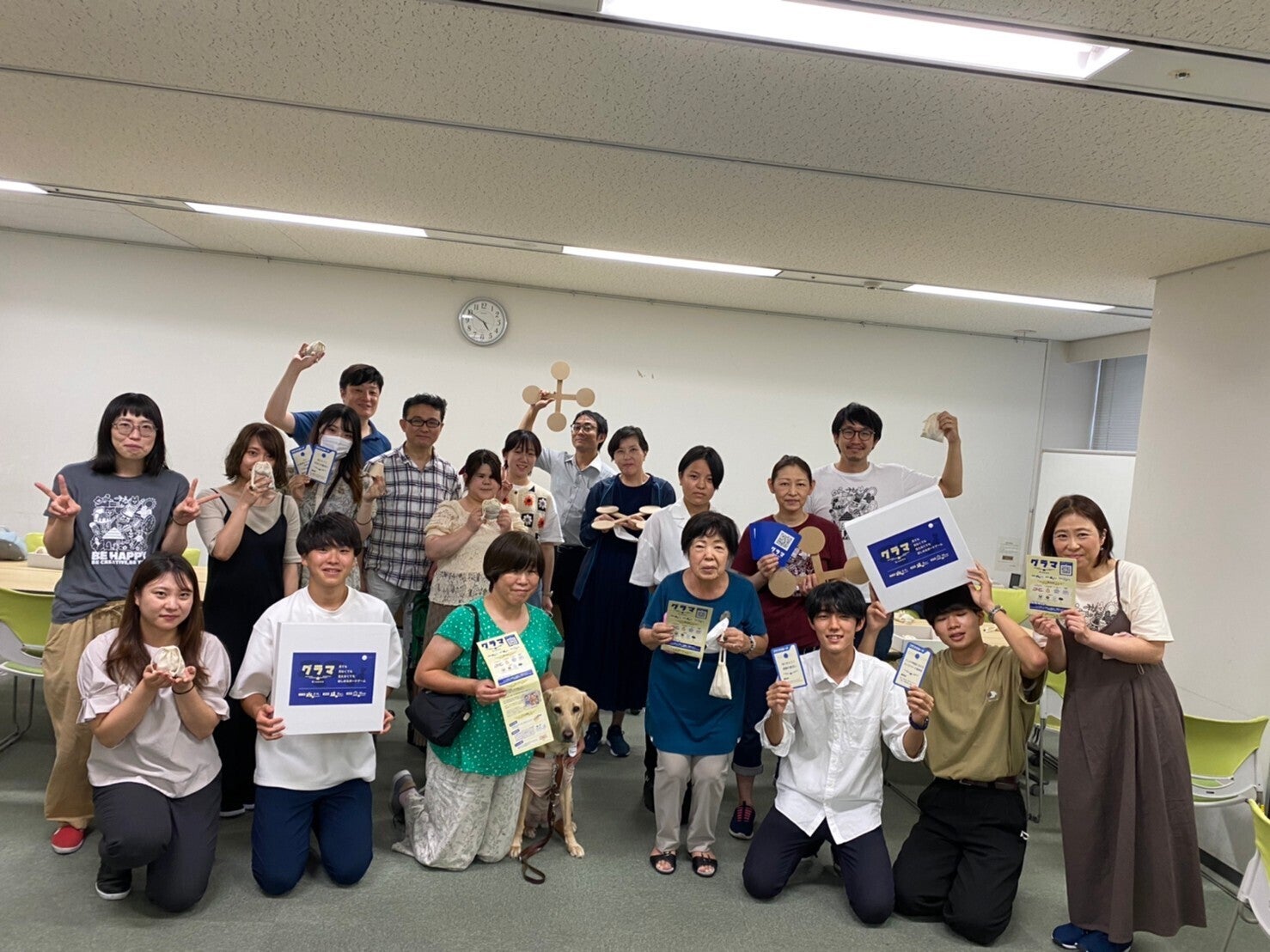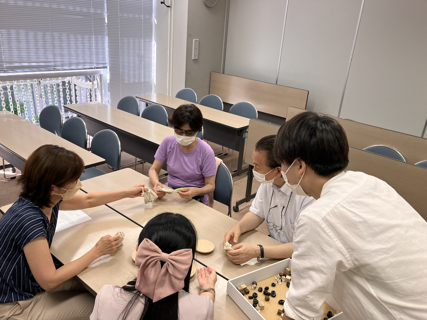 こんにちは、ビーラインドプロジェクトです!8月20日、福岡での体験会の第二回、第三回となる体験会を北九州市にて開催いたしました!当日は、お昼の部と夕方の部で体験会を2回に渡って開催し、一般社団法人生き方のデザイン研究所様による告知で、計25名の方々にご参加いただき、一部では3グループ、二部では5グループにわかれての体験となりましてた。開催にあたっては、ソシオファンド北九州様に会場をご用意いただきました。誠にありがとうございました。中学生から80代の方まで、幅広い年代の方々にご参加いただきました。年齢差や視覚の状態に関係なく、大きな笑い声や歓声が飛び交う素敵な体験会となりました!また、今回は聴覚障害のある方のご参加もあり、初めての試みであるノートテイクや音声認識アプリ「UDトーク」を用いた体験会となりました。私たちとしても初めての体験で至らないところもありましたが、聴覚に障害のある方にも楽しんでいただくことができました!様々なコミュニケーションのあり方を学ぶと共に、丁寧なコミュニケーションや、相手を知ろうとする姿勢の大切さを改めて気づかされる体験にもなりました。さらに今回の体験会では、全てのテーブルで同時に天秤から手を離すという工夫をしました。「3,2,1,せーの!」の合図で手を離し、天秤が崩れたテーブルや、重さが揃ってピタッと止まったテーブルがあり、とてつもない盛り上がりと、一体感に溢れた体験会となりました!また、体験会後には参加していただいた北九州市立大学の学生の方や先生との意見交換会を行いました。手話を勉強されている学生の方もいらっしゃって、とても刺激をいただきました!初めての試みもあった故に自分達も至らない点が多々ありましたが、楽しさと学びで溢れる体験会となりました。ご協力くださった皆様、参加してくださった皆様、お忙しい中足を運んでいただきありがとうございました!福岡編3日目に続くグラマのルールを説明する飛川グラマの体験の様子。巾着袋の重さを感じて、重さの表現を考えていますグラマの体験の様子。巾着袋の重さを揃えていますグラマの体験の様子。ゲーム終了後にそれぞれの重さを持ち比べています体験会後の集合写真。中学生から80代の方まで、聴覚障害のある方や盲導犬ユーザーの方など、たくさんの方が参加してくださいました。