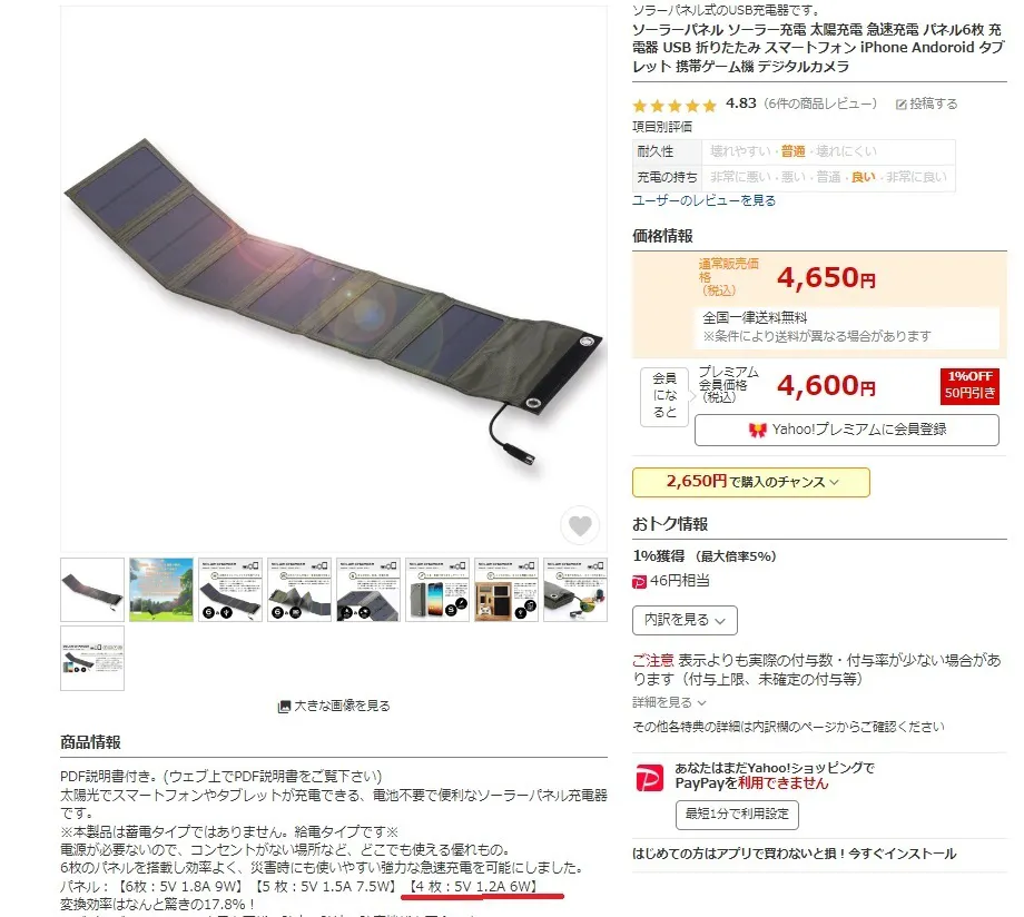 このソーラーパネルはYahoo Shopで販売されているものです。6枚パネル搭載していますが、4枚使用の際、今回の「L3S4W」と同等出力スペック 5V 1.2A出力になります。「L3S4W」の場合、ソーラーパネル以外に、更に ①16,000mAh のバッテリー内蔵、②スマートフォンの10Wワイヤレス充電対応、③iPhone/アンドロイド各スマートフォン対応接続ケーブル内蔵、➃最長24時間以上点灯可能LEDライトを搭載しており、コスパにおいて非常に優れている事がおわかり頂けると思います。ソーラーパネルを4枚搭載して、スマホ接続ケーブルも内蔵しているパワーバンクは今、現在、日本では販売されていません。参考になれば幸いです。