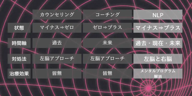 一方で、NLPはそれほど広くは知られていないのですが、カウンセリングやコーチングとは様々な面で大きく異なっており、その効果の大きさもかなり違うのです。