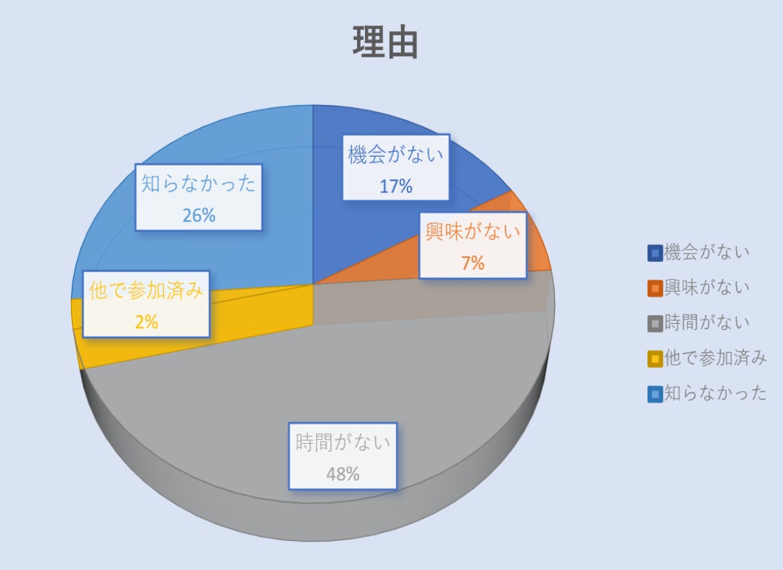 高校生の多くが、時間がないことを理由に学校外での活動に消極的であるとアンケートで回答をしていますが、一方で、知らなかった・機会がないという回答をしている方が43%にものぼり、地域の大人が高校生に、学校外で活躍できる場を提供できていないことがわかりました。