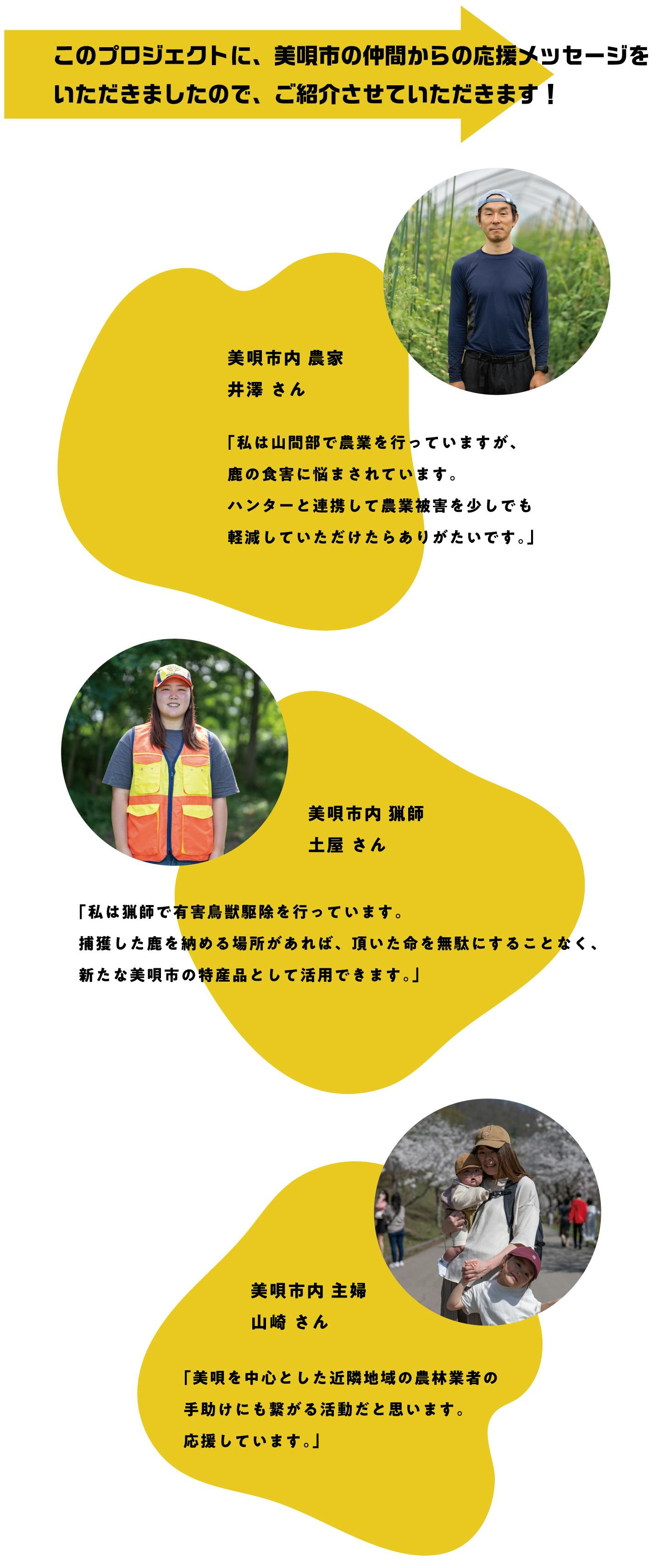 これまで出会った方々にたくさんのご支援をいただき、ここまでたどり着くことができました。駆除鳥獣が食肉処理施設に搬入されることが日本のスタンダードとして構築し、食卓にジビエ肉が上がることが当たり前の世の中にしていきたいと考えています。