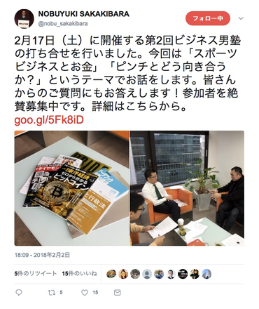 2月17日(土)に開催する第2回ビジネス男塾の打ち合せを行いました。今回は「スポーツビジネスとお金」「ピンチとどう向き合うか?」というテーマでお話をします。皆さんからのご質問にもお答えします!参加者を絶賛募集中です。詳細はこちらから。 https://goo.gl/5Fk8iD