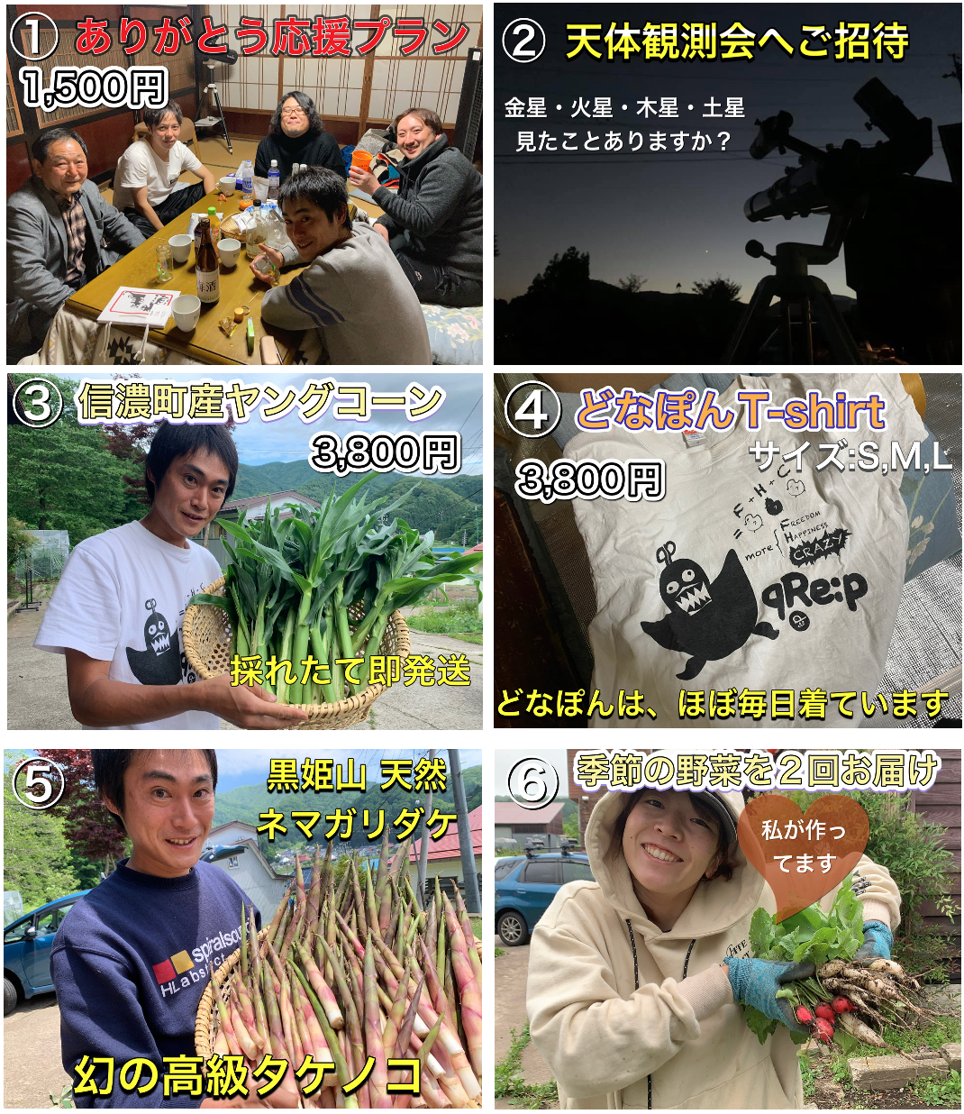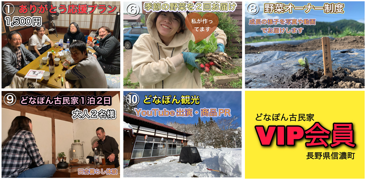 長野県信濃町を知ってもらい、そして「どなぽん古民家」へ来てもらい交流人口を増やしたい。という想いより、以下のリターンをご用意致しました。お気持ちの範囲にて応援いただけますと激しく嬉しいですm_ _m