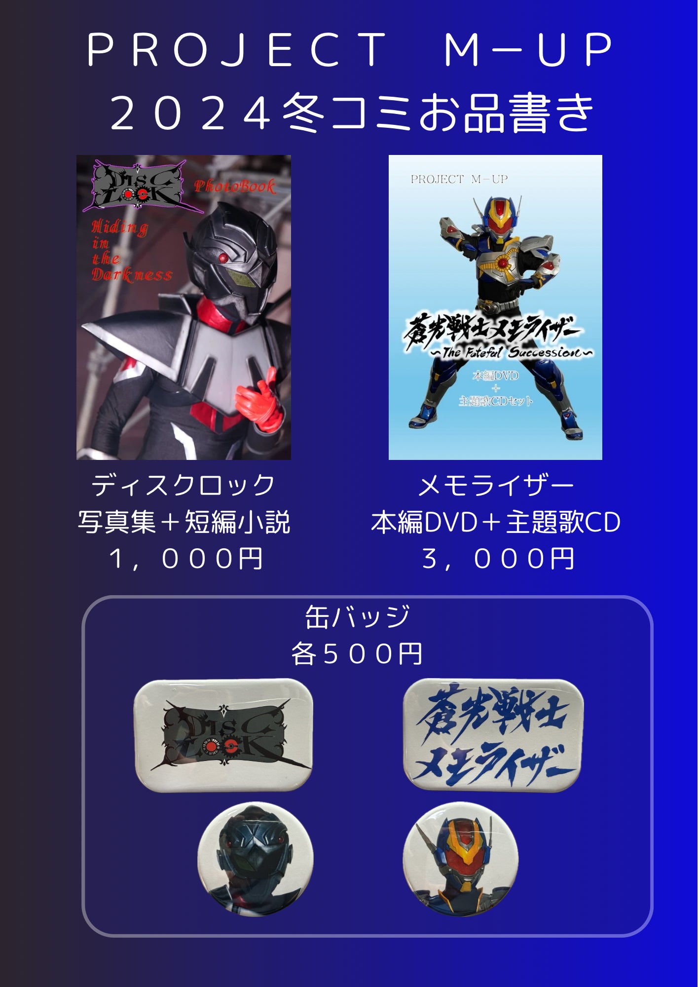 • 支援者の皆様お世話になっております。プロジェクトオーナーの西村正英です。この度、サークル「PROJECT M-UP」として、2024年の冬コミに参戦します!当日は、2024年3月の舞台でデビューした悪役である【怪人ディスクロック】が、写真集を引っ提げて登場予定です。(スペースの関係で、メモライザーは呼べません!申し訳ございません……)また、本プロジェクトにてリターンとさせていただいた映像本編のDVDと主題歌CDをセットにして、新規パッケージにて頒布します。価格は3000円です。とは言えこのままですと、本プロジェクトにてご支援頂いた皆様に対して、申し訳が立たないと考えました。クラウドファンディングのリターン品は、当時の私に今ほどの画像や印刷物の編集技術がなく、かなりの簡易包装でしたし、そもそもDVDや CDの支援コースはもっと高額でした。そこで、本プロジェクトにて【3000円以上】ご支援の皆様には、お問合せ頂ければ、冬コミで頒布するものと同じ【新規パッケージ】版のセットを、無料で送付します。お問合せは、以下必要事項をメールくださいませ。memorizer001@gmail.com【必要事項】ご氏名ご住所(わかれば)CAMPFIREのアカウント名(あれば)メモライザーへの応援メッセージ以上、どうぞよろしくお願いします。 もっと見る
