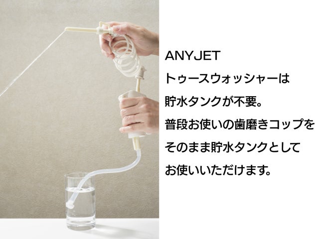 ANYJET トゥースウォッシャーはコップの水にホースを突っ込むだけで使えるので、巷にある口腔洗浄器のように貯水タンクが不要です。