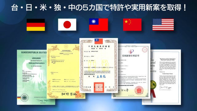 電力を使わずハンドポンプの力だけで超強力なジェット噴射を生み出す画期的な技術は、開発した台湾をはじめ日本、ドイツの3カ国で実用新案、中国、アメリカでの特許を取得。実用新案として日本で保護されます。