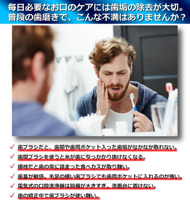 歯垢のお掃除に使うのはお水だけ。刺激が少ないので敏感な人でも使える。 -