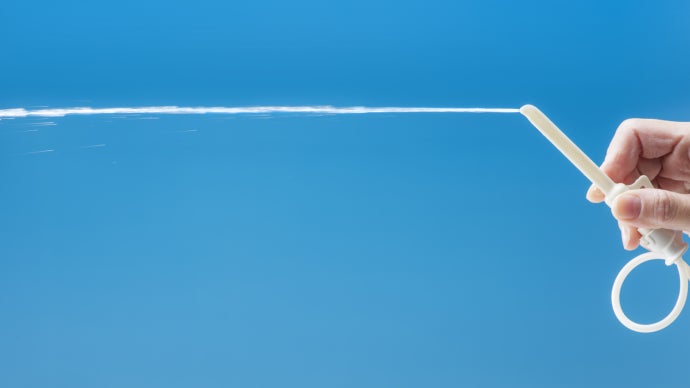 A. ANYJET トゥースウォッシャーを強く握り過ぎているのが原因です。ANYJET トゥースウォッシャーは1kgの握力でも、5kg /cm²の水圧を生み出します。八重歯程度の歯の隙間や歯周ポケットなら1回程度で、奥歯の歯周ポケットなら2~3回程度で汚れを落とせるので、必要以上にポンプを繰り返す必要はありません。
