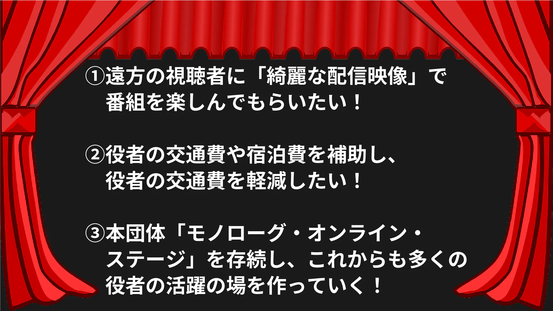 モノステは始まった頃からクラファンのようなスタイルで運営してきました。新たなフェーズを迎えるに当たって大きな支援額を掲げるのは正直心苦しいのですが、今回目的が違います。コロナ禍における、対面公演。リスクが多く、何か起きれば即中止。僕は運営から離れますが、このチャレンジに挑む新体制のメンバーを是非とも応援してください。彼らの熱意によってモノローグが日本の演劇界に更に広まることを祈っています。