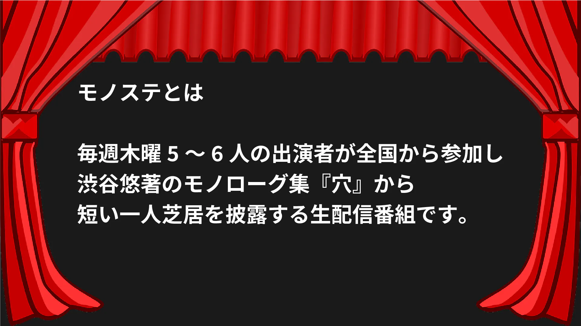毎週木曜5~6人の出演者が全国から参加し、主宰・渋谷悠著のモノローグ集『穴』から短い一人芝居を披露する生配信番組です。
