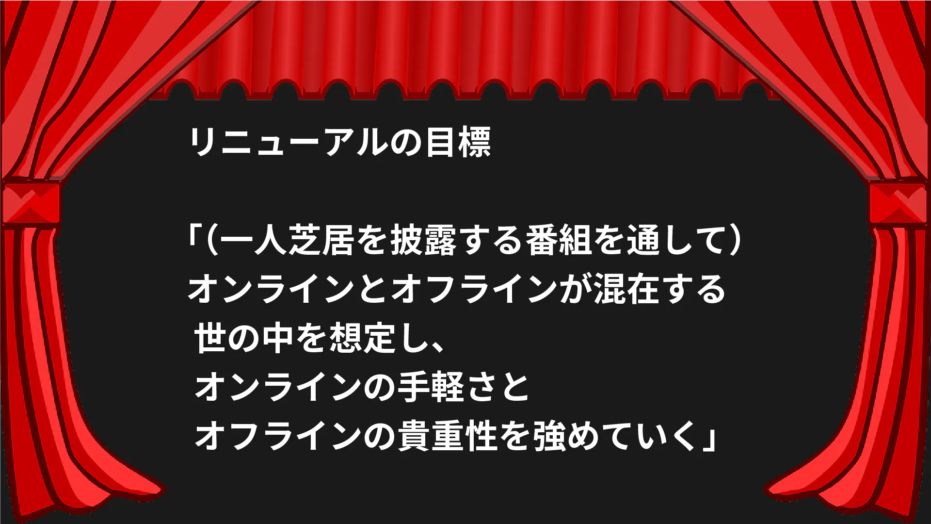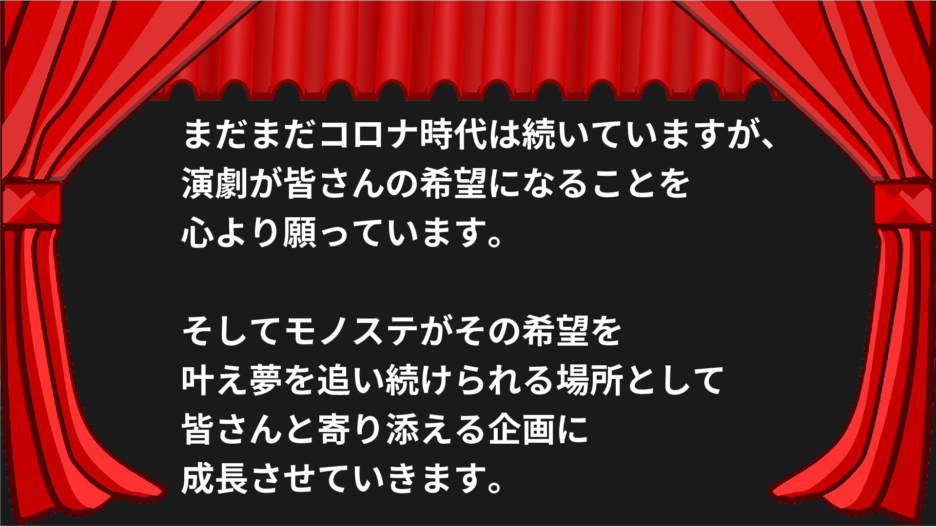 2年間でまた世の中は変化しています。これからアフターコロナを見据えて、より多くの方に希望と目標をもって欲しい!モノステを舞台の代替ではなく、コロナと共存しながらも夢を諦めずに誰もが演劇ができ、成長していける場所にしたい!
