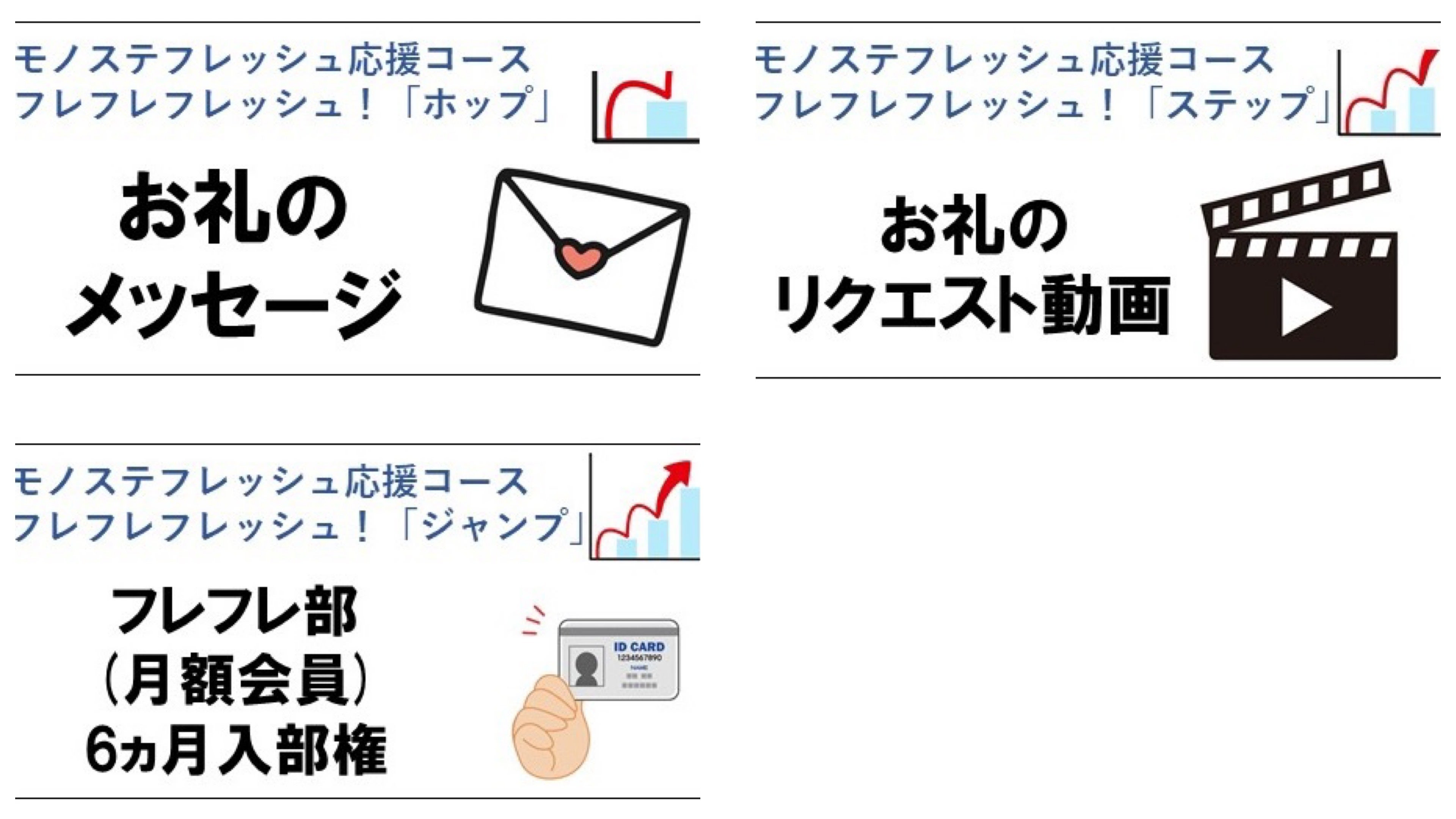 モノステフレッシュメンバーからの、新しく始まるファンクラブ(フレフレ部)の6か月分の入部権をご提供いたします。対象期間は7/1から12/31です。実際にフレフレ部に参加するよりも、2割近く低い値段で参加できる条件となります。