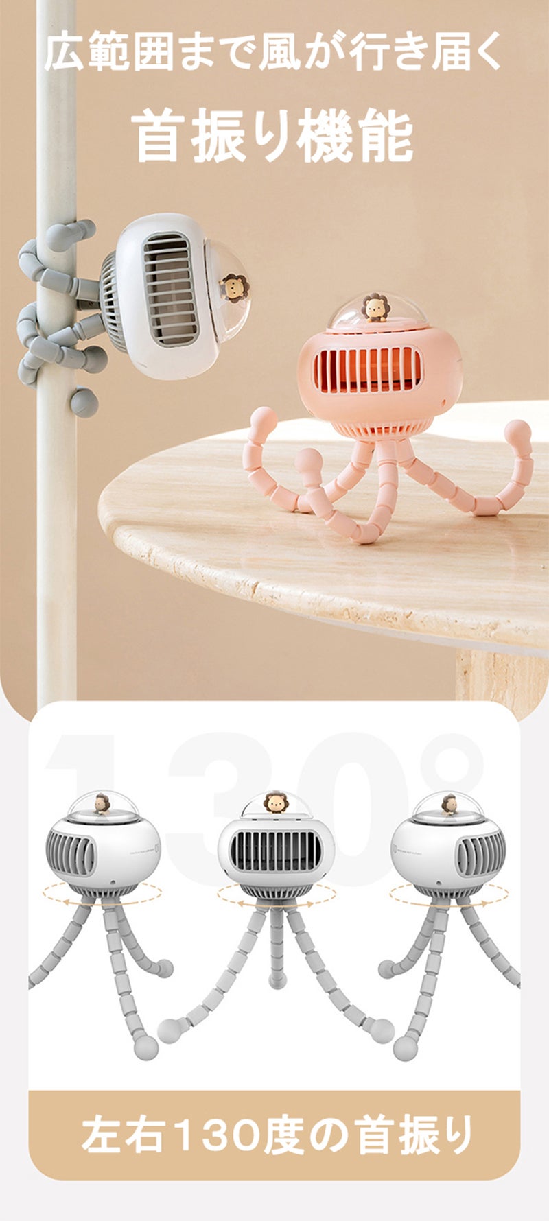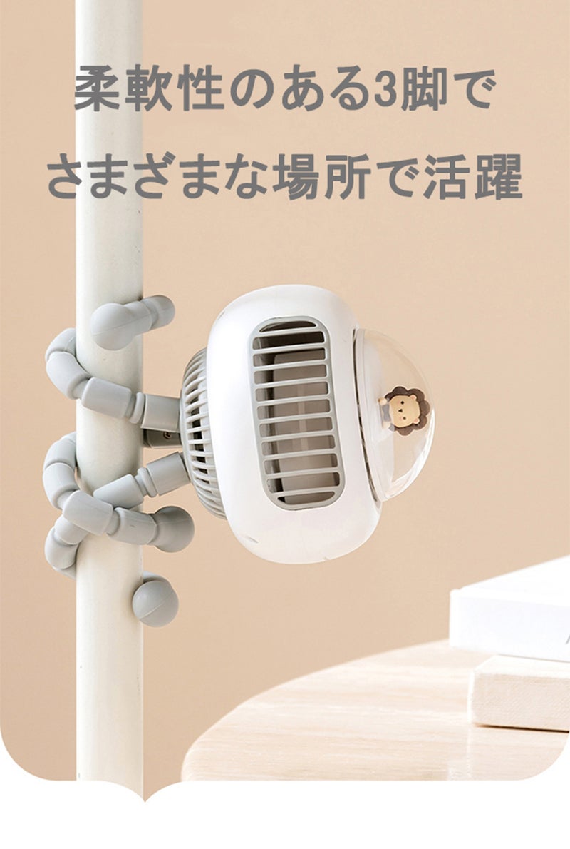 好きな方向に簡単に曲げられるフレキシブルアームで取り付け場所を選ばないベビーカー扇風機。巻き付けたり吊り下げたり、いろんな場所で活躍できます。