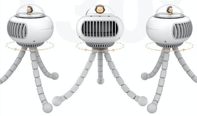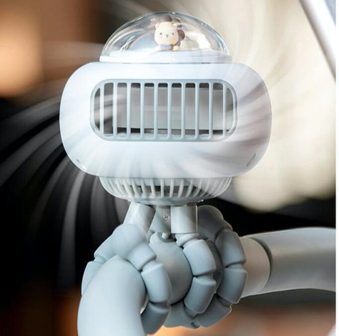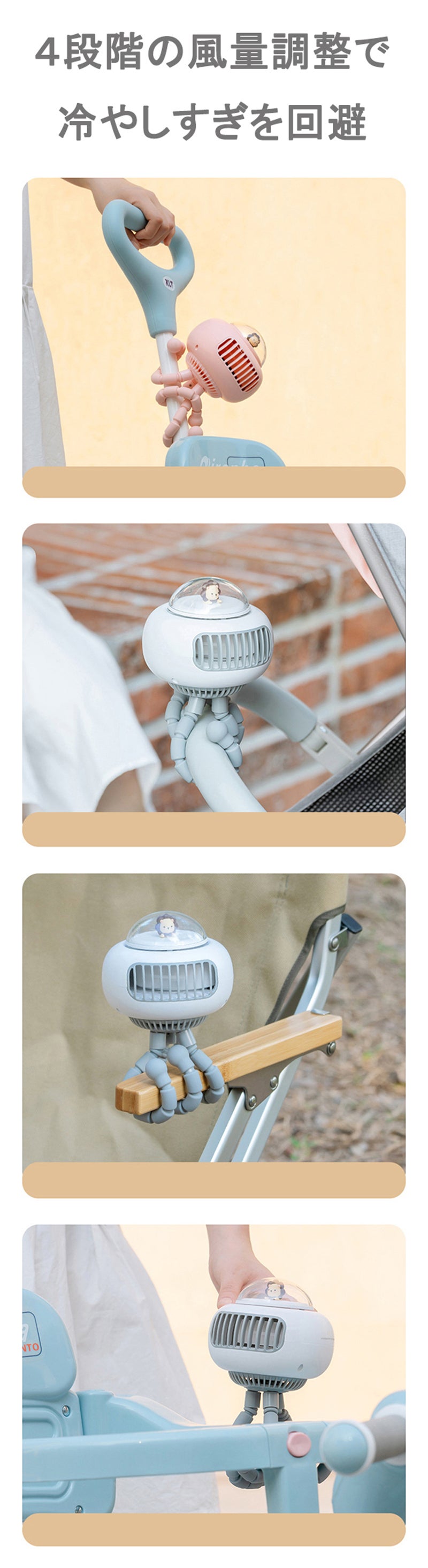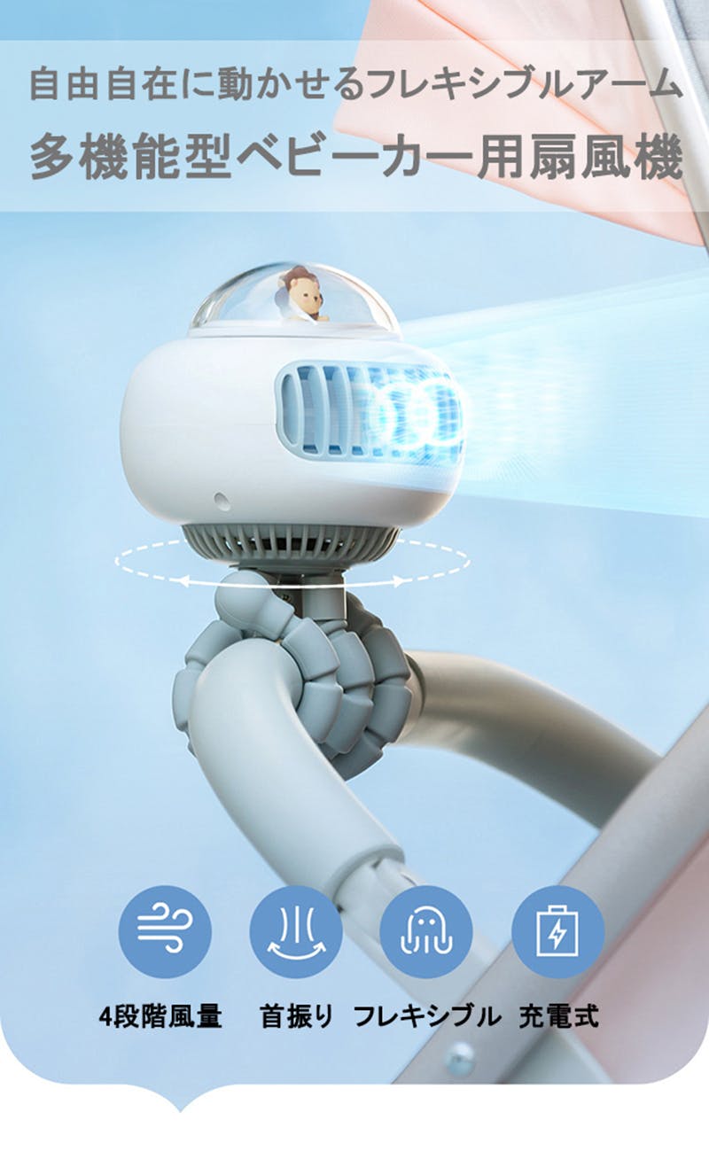 外出時に赤ちゃんを涼しくするフレキシブル式のベビーカー扇風機。
