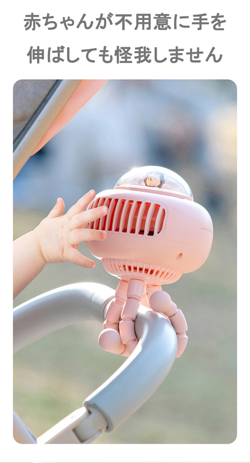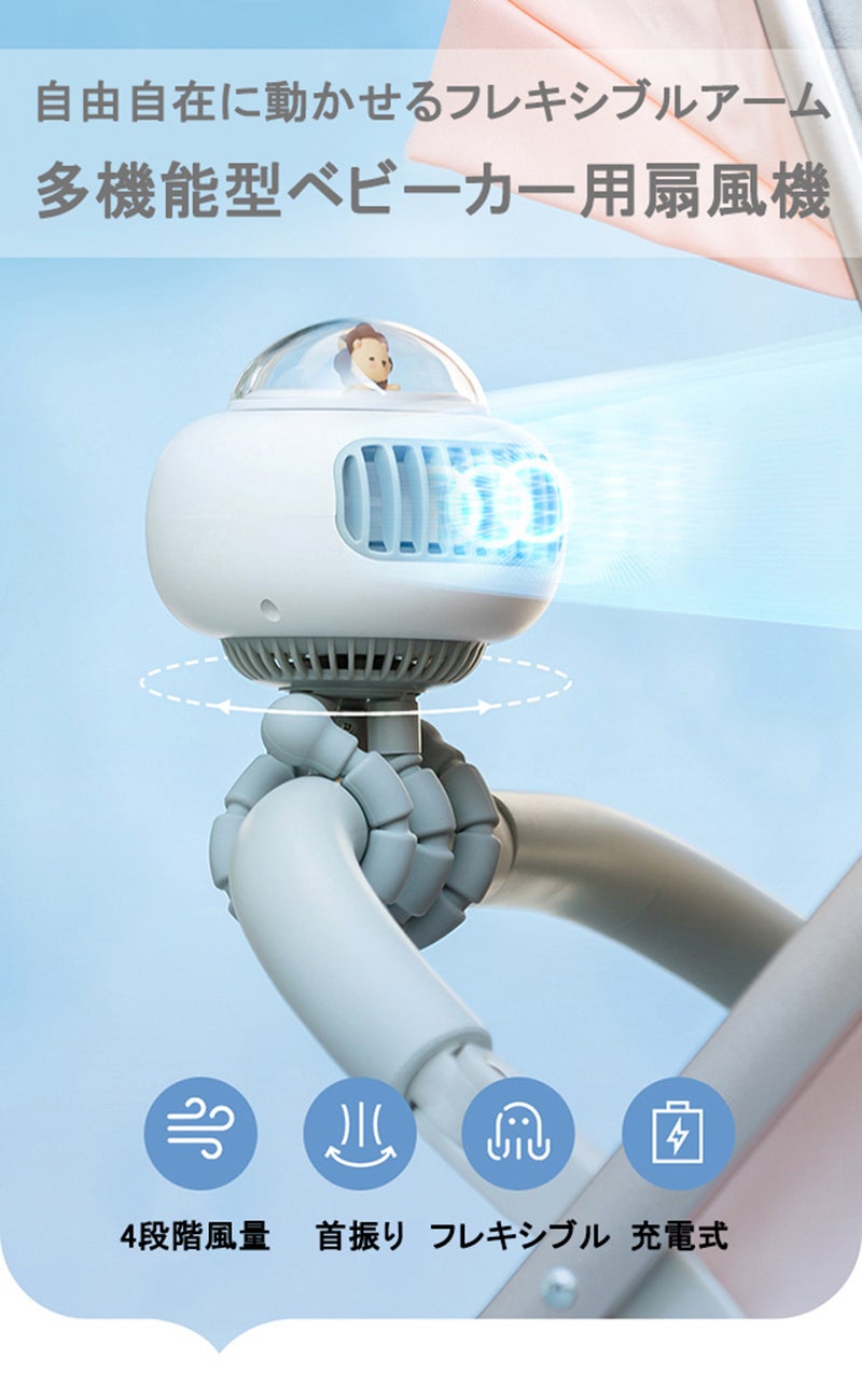 外出時に赤ちゃんを涼しくするフレキシブル式のベビーカー扇風機。