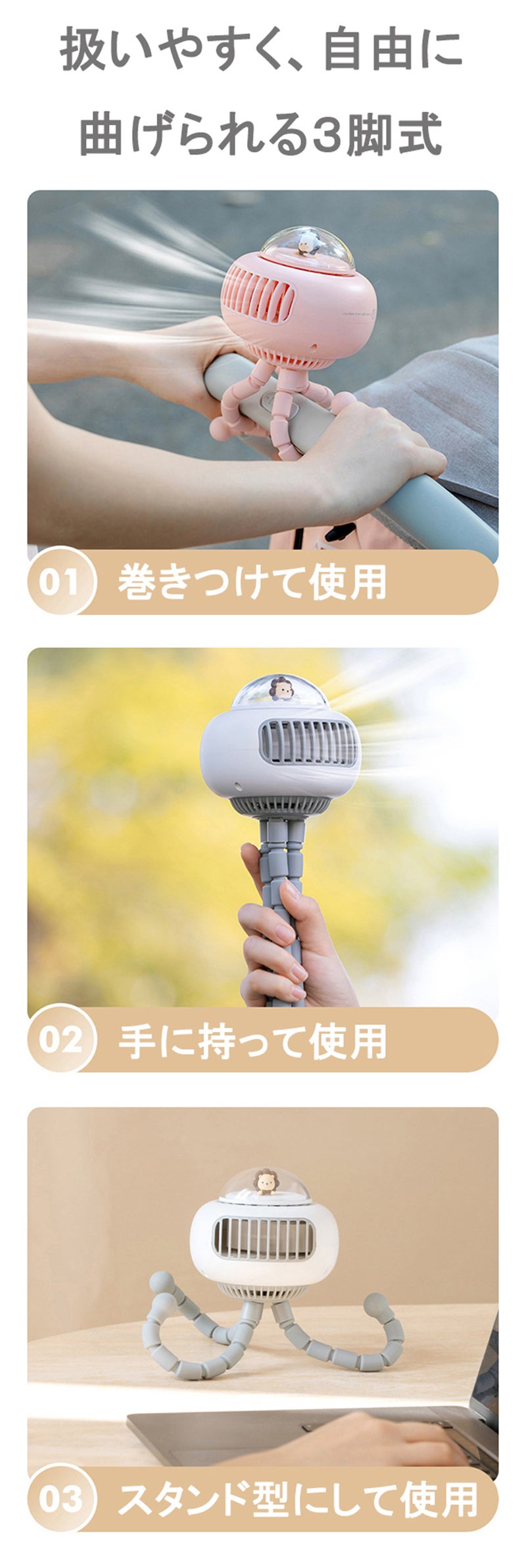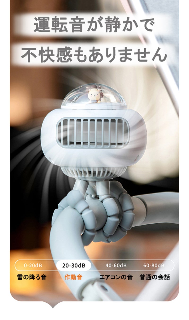 好きな方向に簡単に曲げられるフレキシブルアームで取り付け場所を選ばないベビーカー扇風機。巻き付けたり吊り下げたり、いろんな場所で活躍できます。