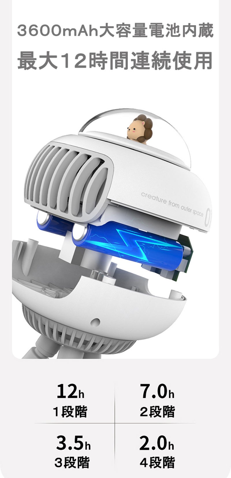 外出先やお出かけで使いやすい充電式。フル充電すれば最大12時間の連続使用が可能で、コストパフォーマンスと高性能を両立した便利アイテムです。