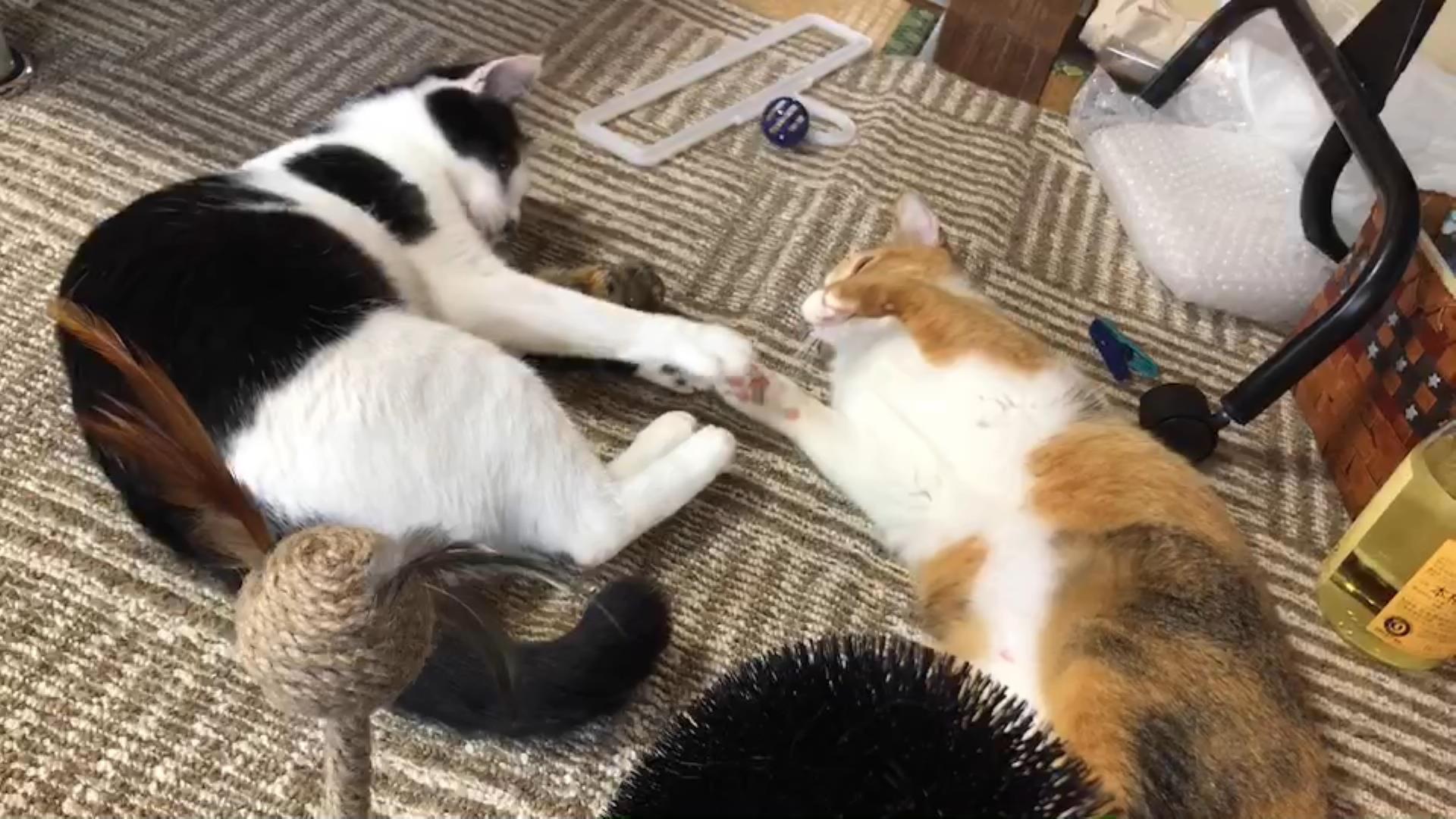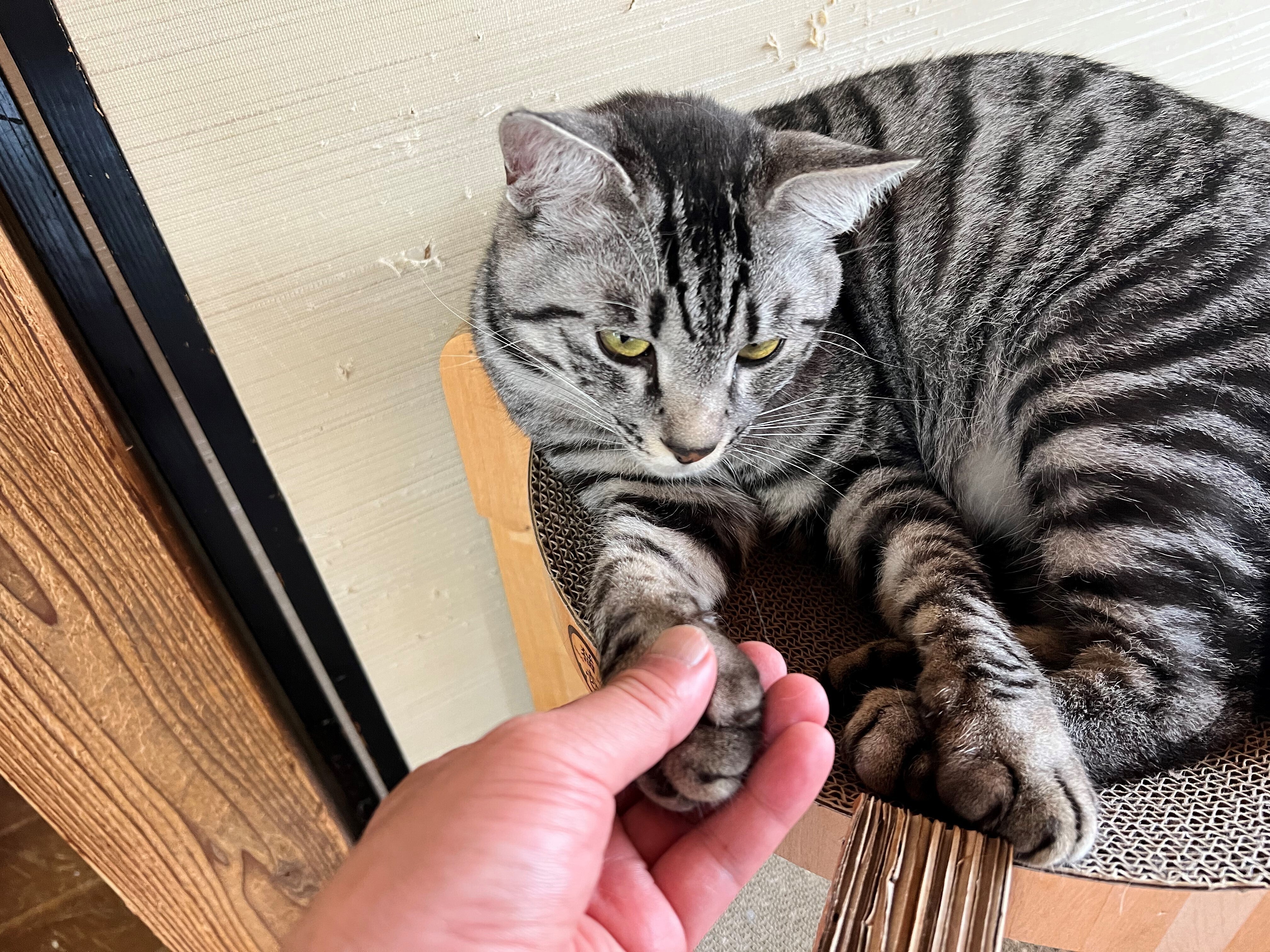 2022/05/10 12:06爪とぎタワーが大好きなライム君。我が家ではキャットタワーにジンとカルアとアサヒ、爪とぎタワーにライム、猫用部屋にクリアと別れてくつろぐ事が多いのです。この日はライムがいつもより静かだったので、普段は嫌いな握手に挑戦。パートナーだと絶対に拒否するのですが、私は普通にいけました(笑)どんどん大きくなっていくライム君の成長が楽しみです(^^) もっと見る