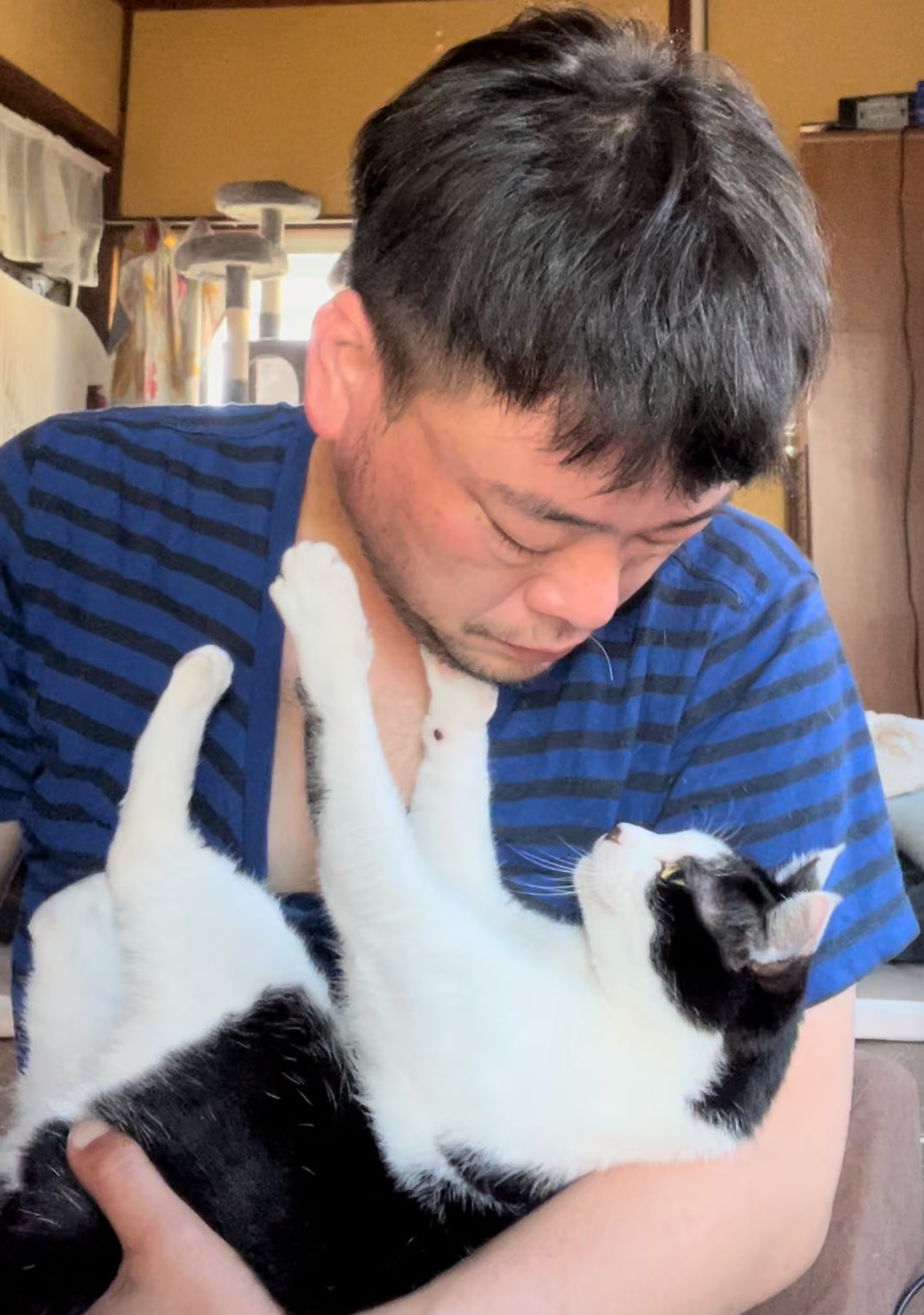 アサヒにとってのふみふみ対象ポイントは私のアゴみたいです。ここから私の顔を自分に近づけるように引っ張り、そこから私の唇にガブ!!