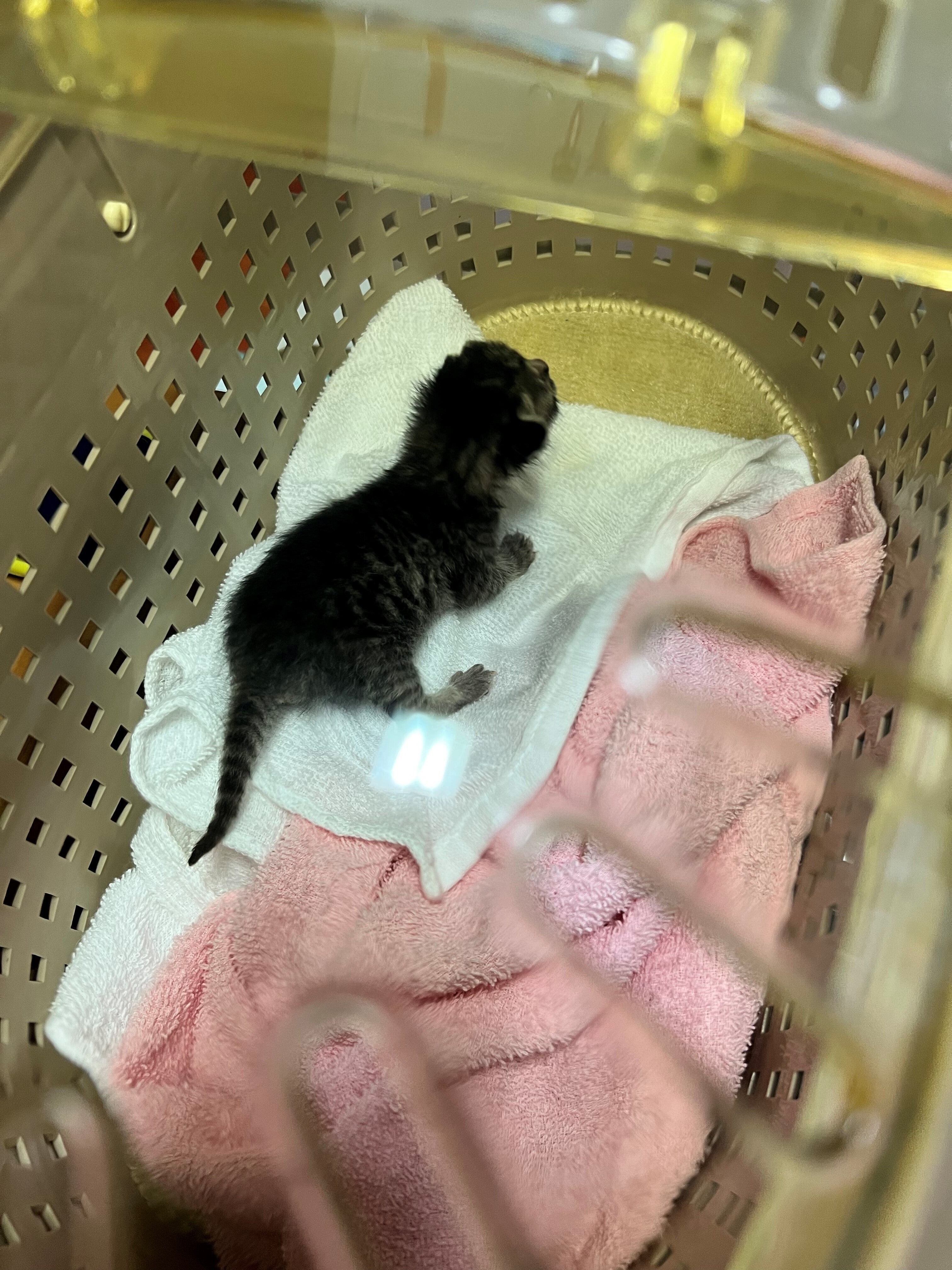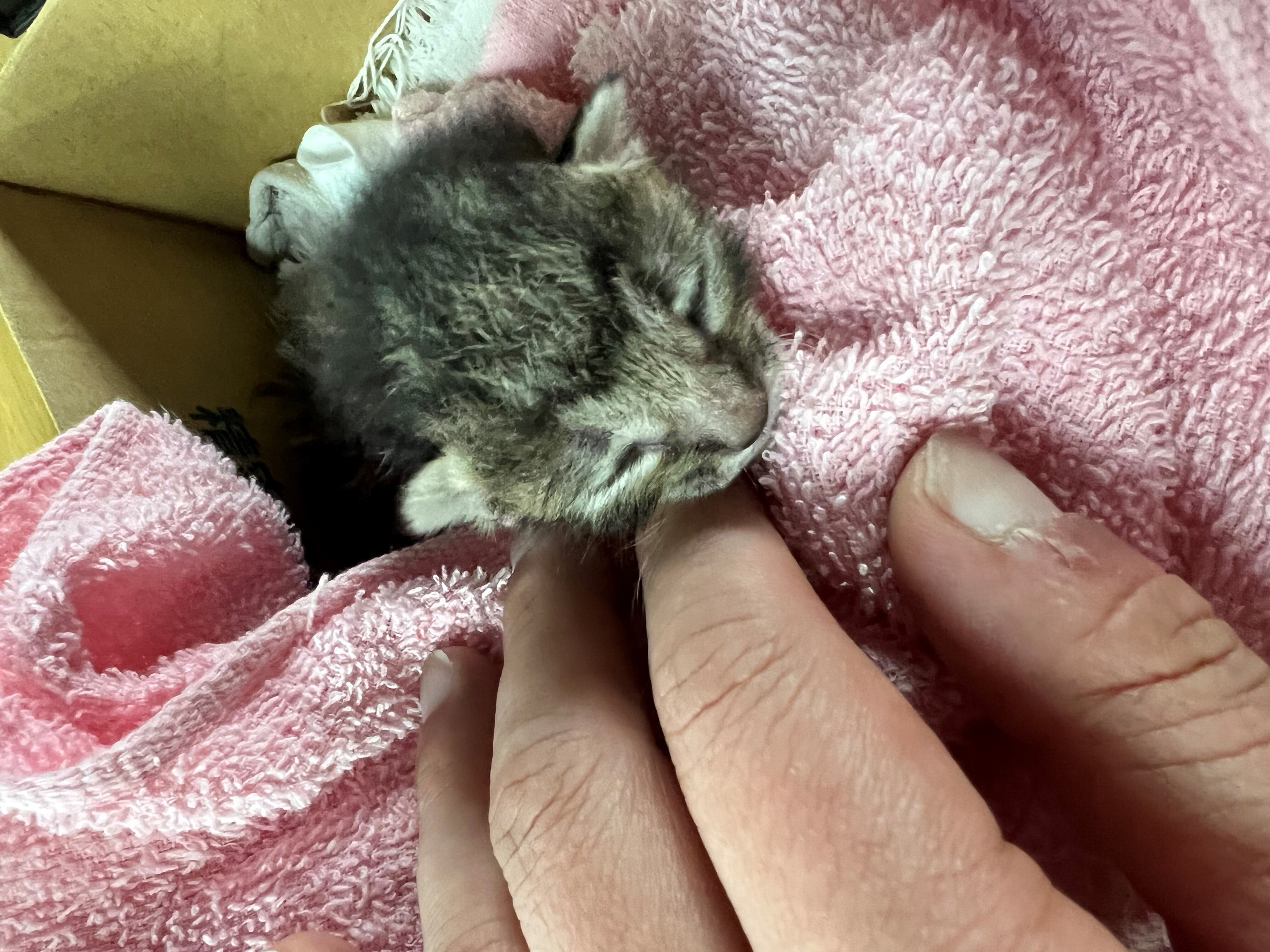 午前中に同級生から連絡があり、職場のゴミ捨て場に猫がすてられているとのこと。私が引き取るからと伝え連れてきてもらいました。目も開いてない、へその緒すら取れていない子猫ちゃん。どういう気持ちで捨てたのか、意味が分かりません。預かった後は元気に鳴いているし、ミルクもちゃんと飲めて排泄もできました。仕事が終わり次第、動物病院に向かいます。何とか生きてくれたら、と思っています。