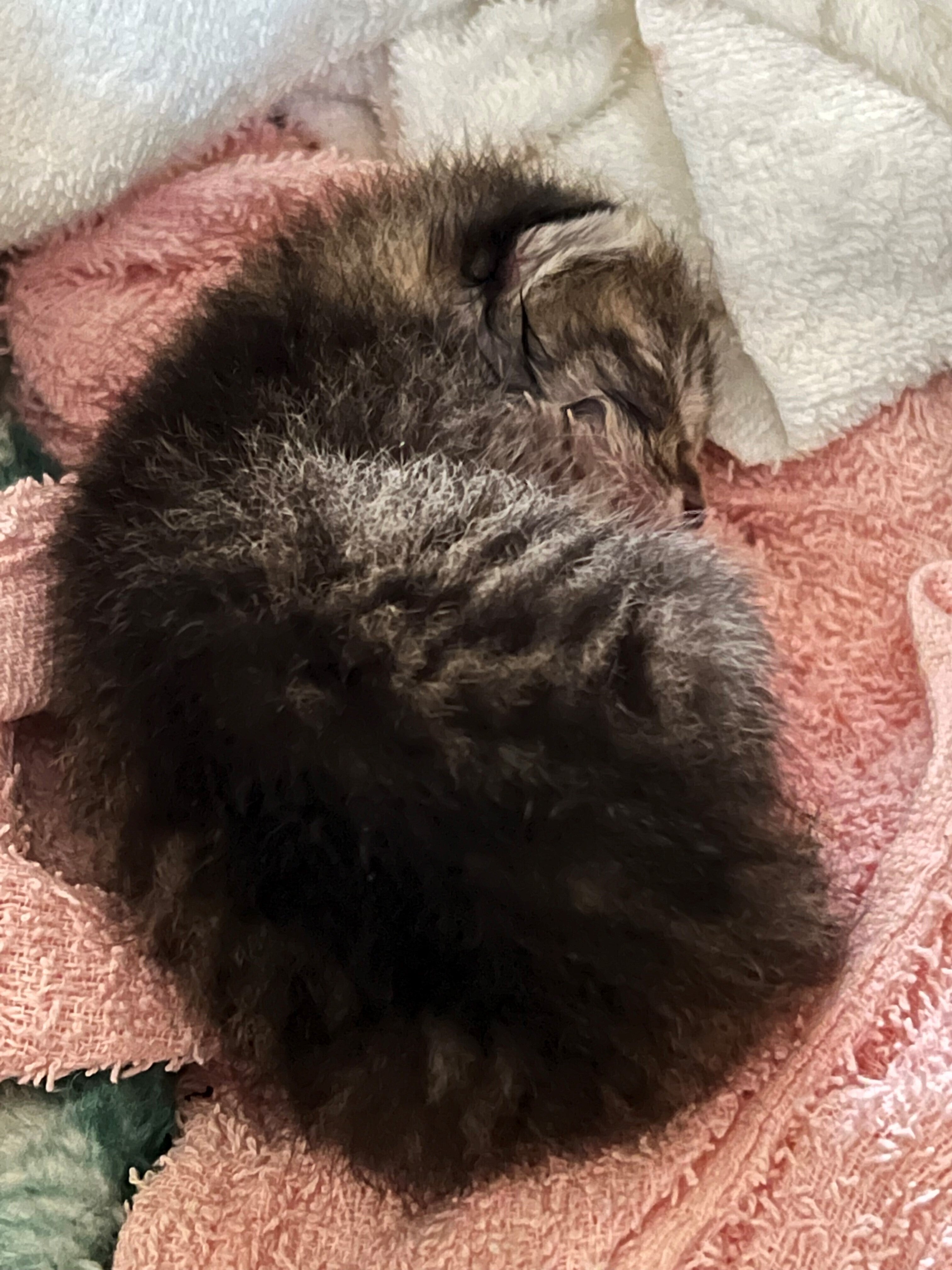 ゴミ捨て場に放置されていた子猫。目も開いておらず、へその緒もついたまま。誰がこんな事をするのだろう?と憤りを感じながら、我が家で保護してお世話を続けておりました。夜中も2時間置きにミルクをあげていました。午前3時には元気にミルクを飲んでいたのですが、午前6時頃に様子が急変。触っても反応せず、呼吸も弱い状態に。本当に何が起こったか分からず原因も不明でした。必死で温めたりしましたが、残念ながら午前7時頃に小さな命は旅立ちました。名前もスイちゃんと決めてお世話を始めた矢先の出来事で、私もパートナー泣くことしか出来ませんでした。同時に想像以上に新生児のお世話は難しいのだと学びました。せめてもの救いは1人寂しく逝くのではなく、私たちの手の中で最期を看取れた事だと思います。うちの庭に埋葬し、毎日語り掛けるようにしています。今後繰り返すことのない様に、細心の注意を払って保護活動を続けていきます。