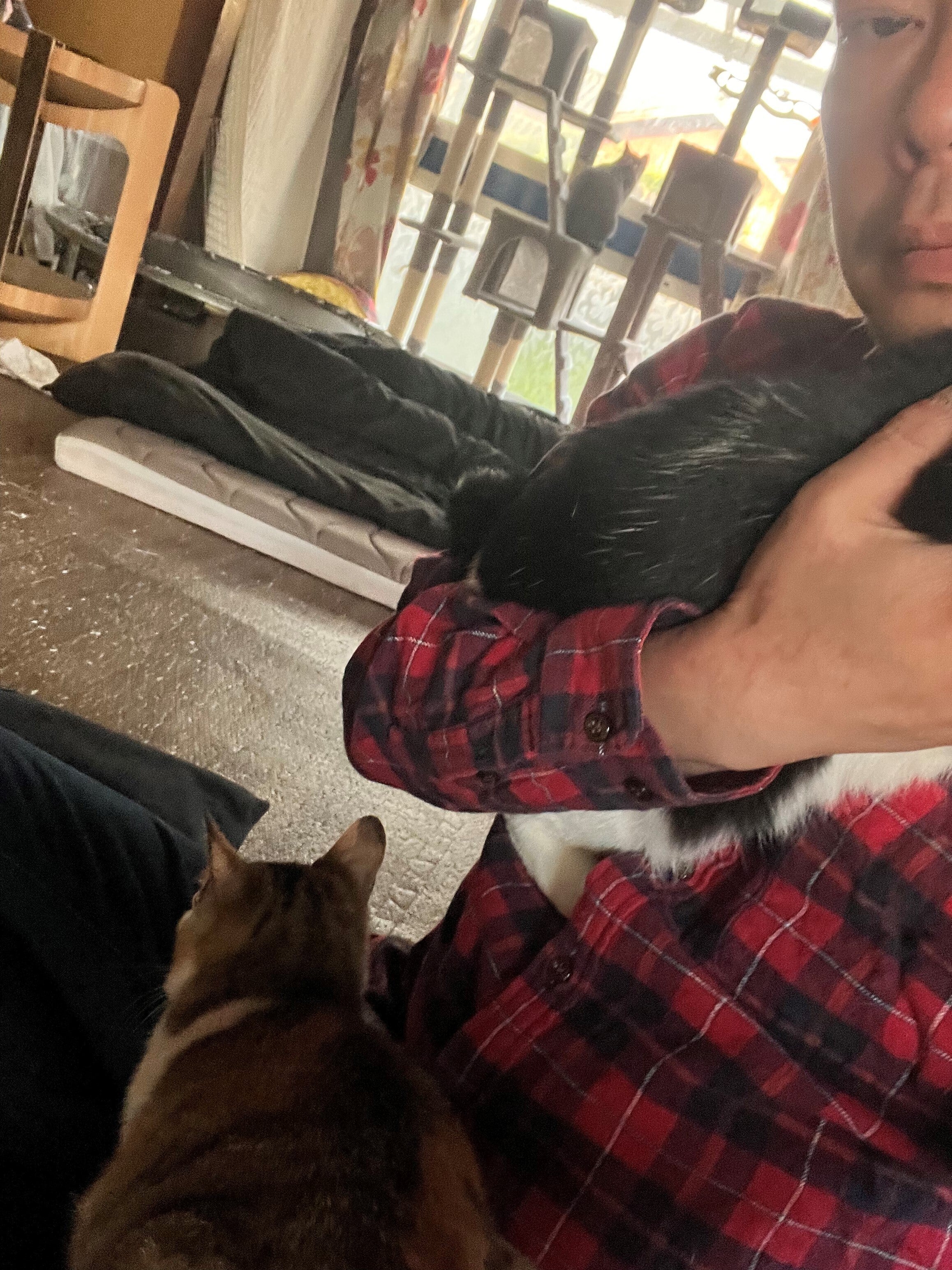 朝の出勤前の一枚です。 腕の中にアサヒ、膝の上にはカルア。この2匹が争奪戦を繰り広げます。アサヒは先にカルアがいるとスネて帰るので、まずはアサヒを抱っこ。カルアはお構いなしの性格なので、後から膝に来る感じです。 カルアは本当にKYなので、何度も私を起こすために顔に登ってきます。アサヒも食事中に何度も抱っこに来ます。 嬉しいのですが、少しだけ困ってしまう瞬間です。