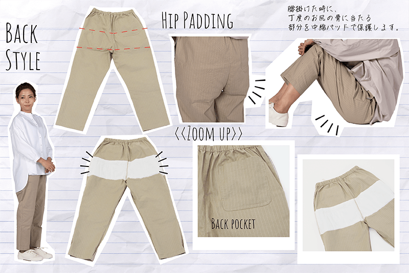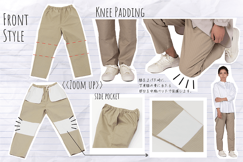 膝とお尻の部分には80g/m2の中綿を表地とスレキ(ポケット布)で挟み込み優しく包み込む使用になっています。