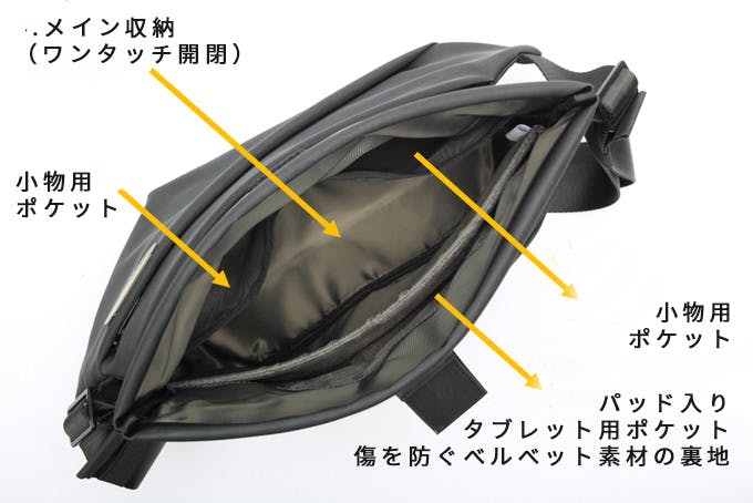 美しいフォルムと機能性の融合, マグネットで開閉する大容量スリングバッグ
