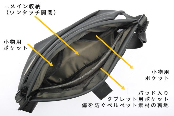 バッグパックなど大型バッグによくある傘やペットボトルを入れるサイドポケット。 そんなサイドポケットのような、アクセス簡単なポケットをスリングバッグにも採用したのがセミオープンポケットです。